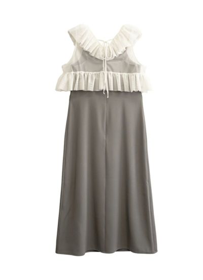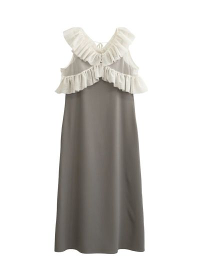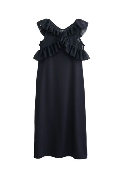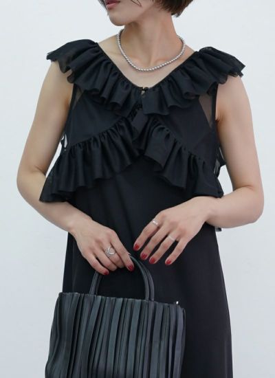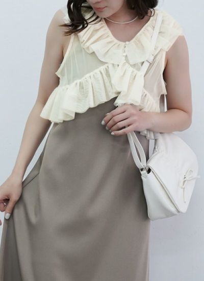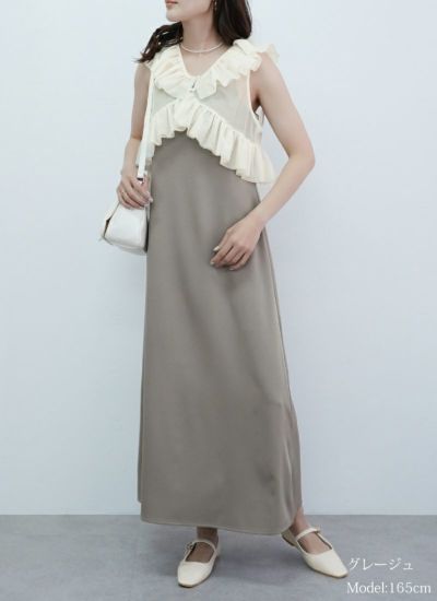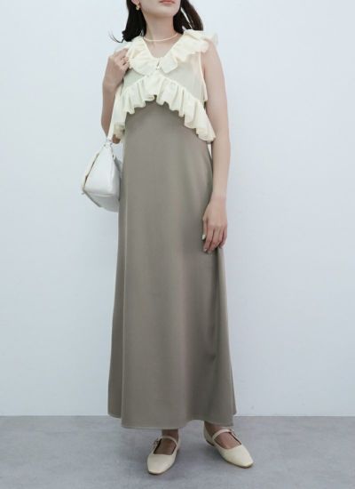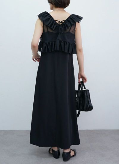 トレンドのチュールフリルベストとキャミソールワンピースのセットアイテム。