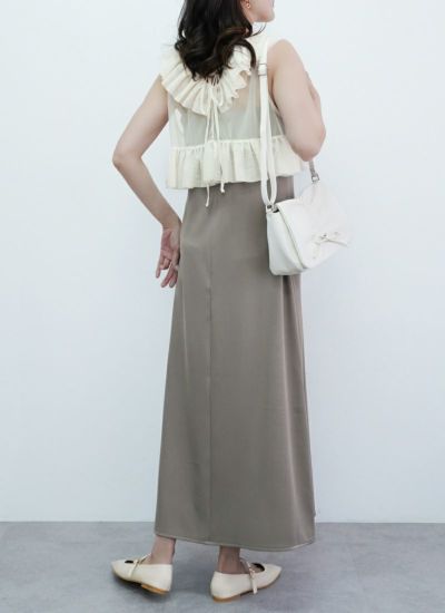 透け感のあるベストが華やかさを演出し、シンプルなワンピースに重ねるだけでこなれた印象に。