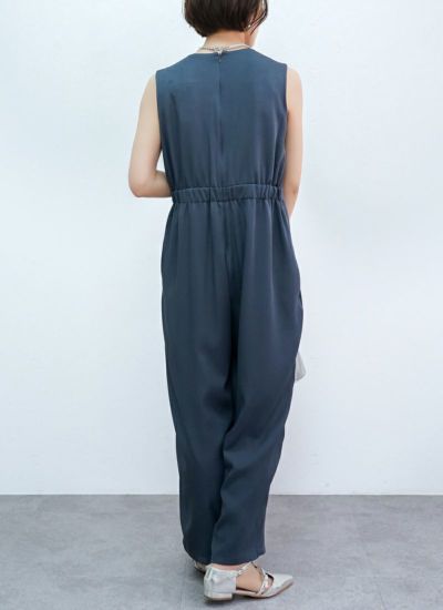 オールインワンは後ろウエストのゴム仕様は適度にゆとりがありながらも、優しく体にフィットしてスタイルアップを叶えるデザインに。