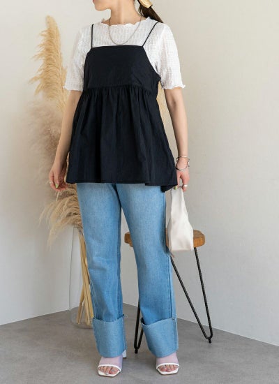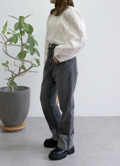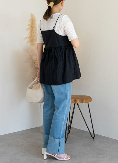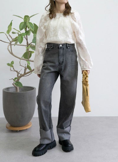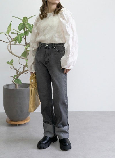 ハイウエストシルエットでインして着用すると よりすっきり見え脚長効果も期待出来ます。