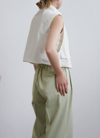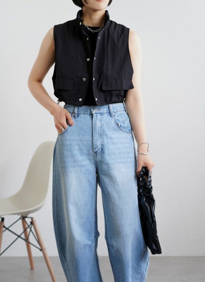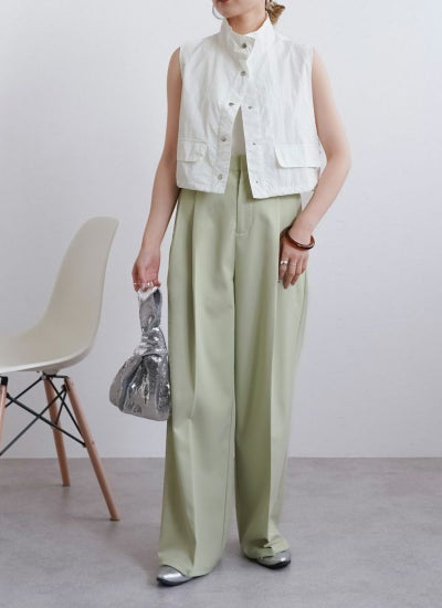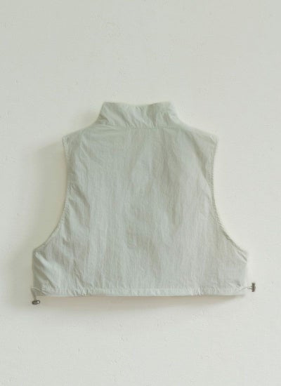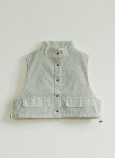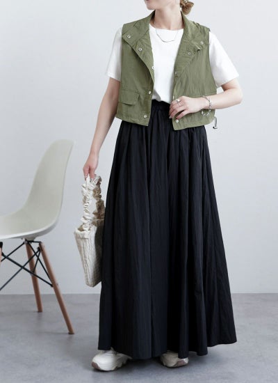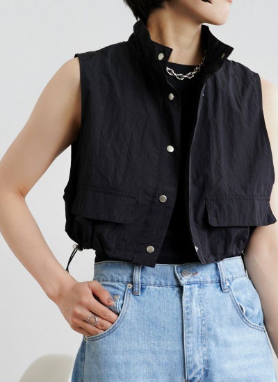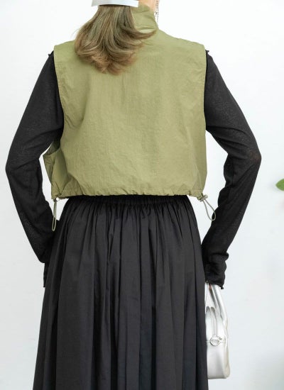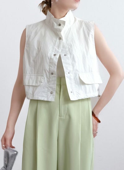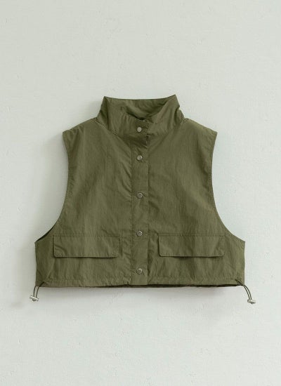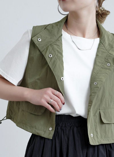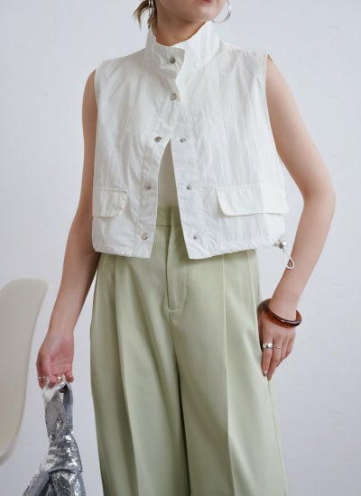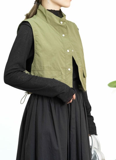 ポケットがアクセントになったミリタリーベストは、ネックラインの表情を変えられるスタンドカラーです。