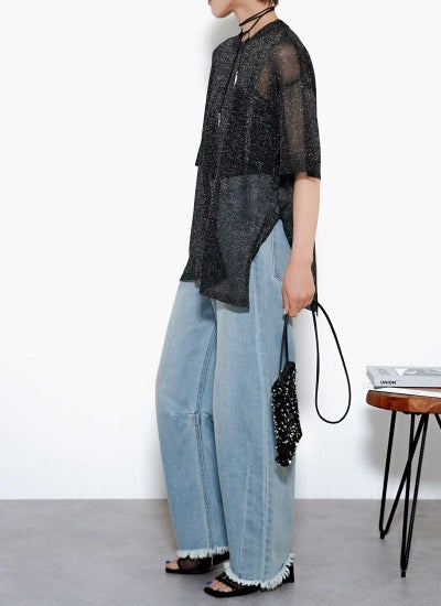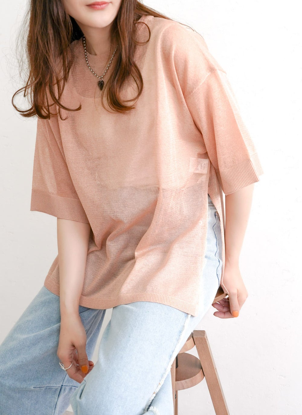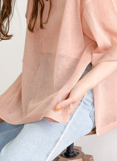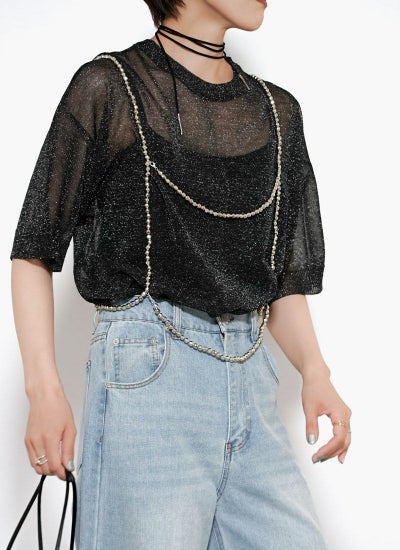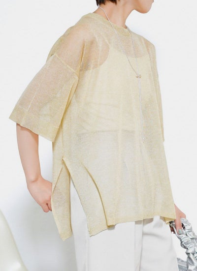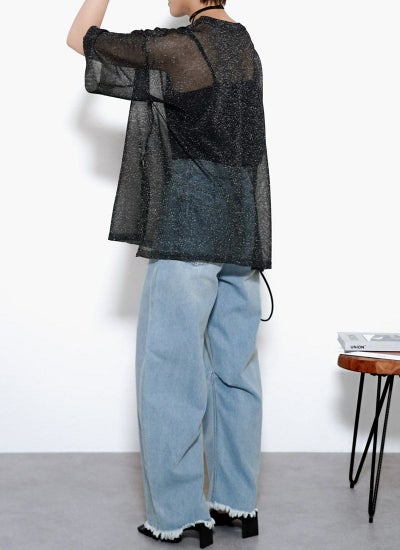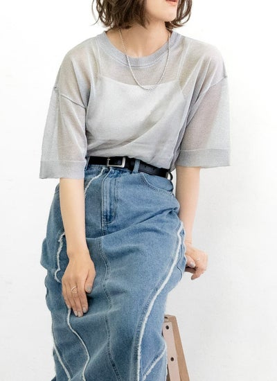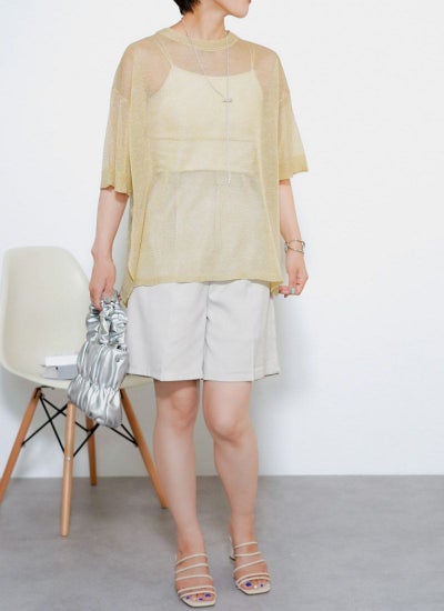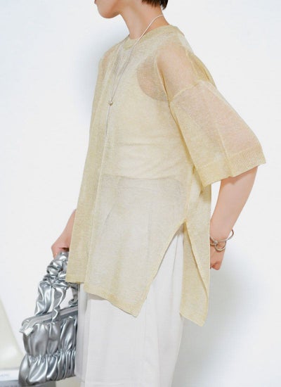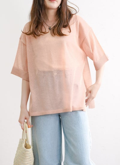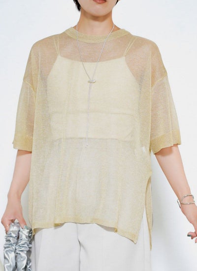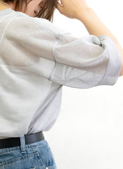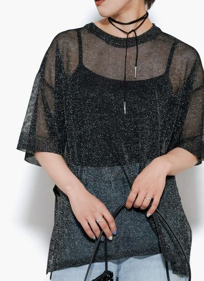 細かなラメがキラキラと輝く華やかなシアーニット。