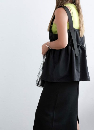 ペプラムシルエットで可愛さをプラスしつつ、ナイロン素材で甘くなり過ぎず