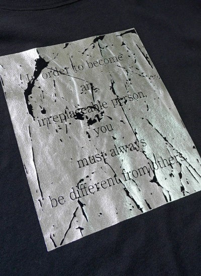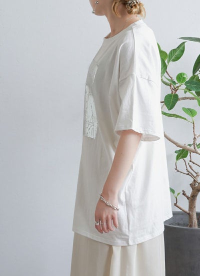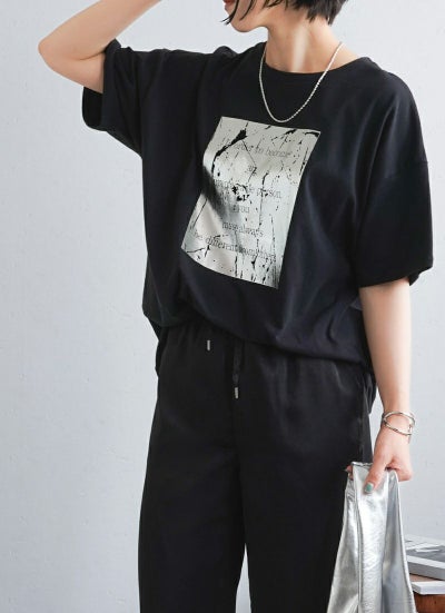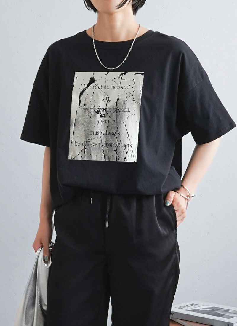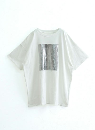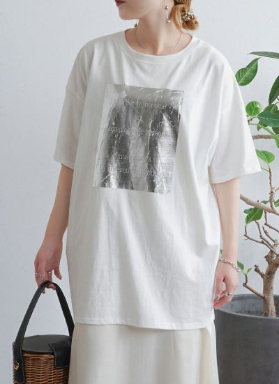 今年トレンドとなっている箔プリントを施したTシャツ。