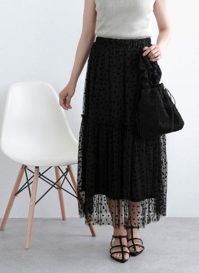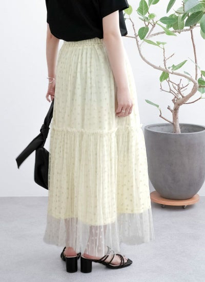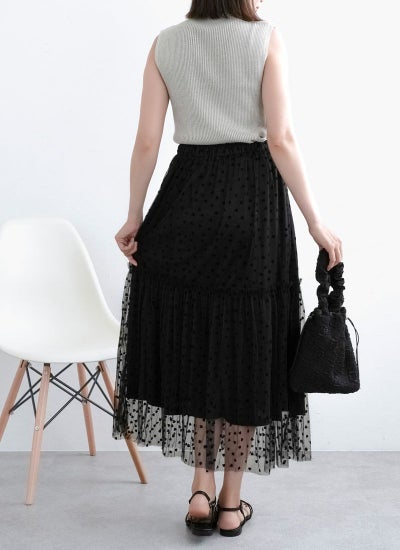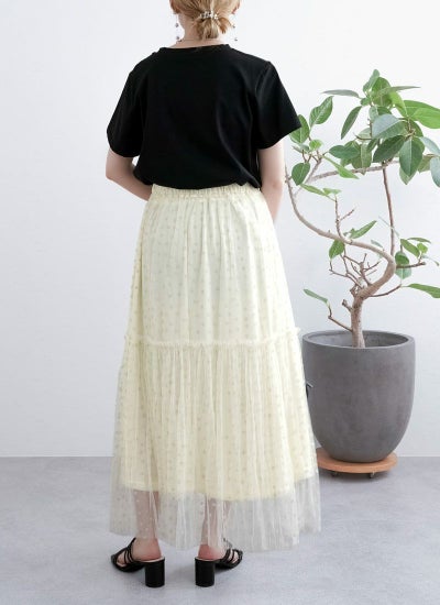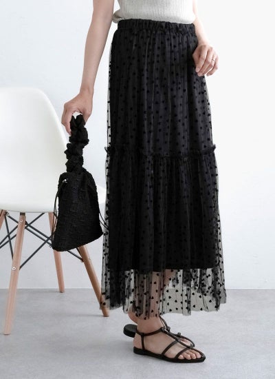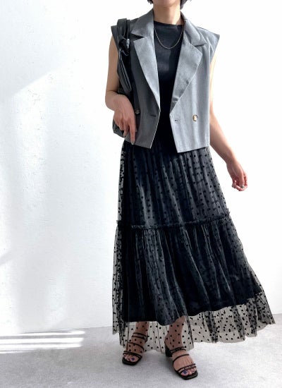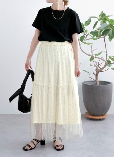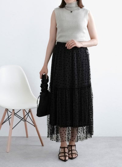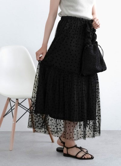 歩くたびに揺れるチュールがエアリーな印象に導きます。 ハート柄でも小さいモチーフとなっておりますので、甘くなり過ぎず大人女子も着やすい1枚に◎