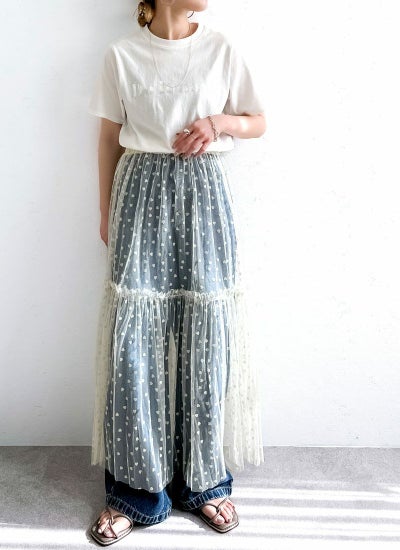 インナーのペチコートを外して、チュールスカートのみをデニムやパンツと重ねたレイヤードスタイルもおすすめ。