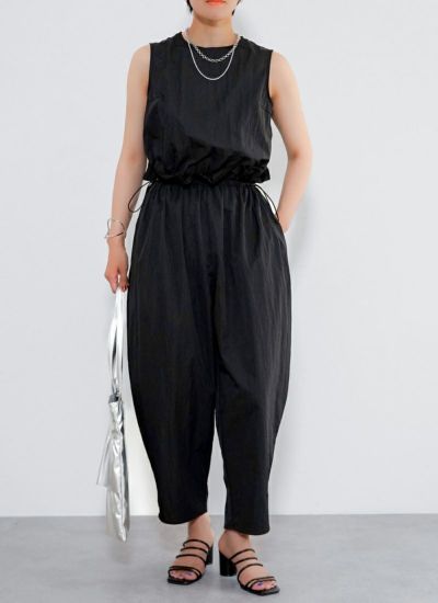 タフタの素材感が魅力のギャザーコクーンオールインワン! ボトムはボリューム感のあるコクーンシルエットで