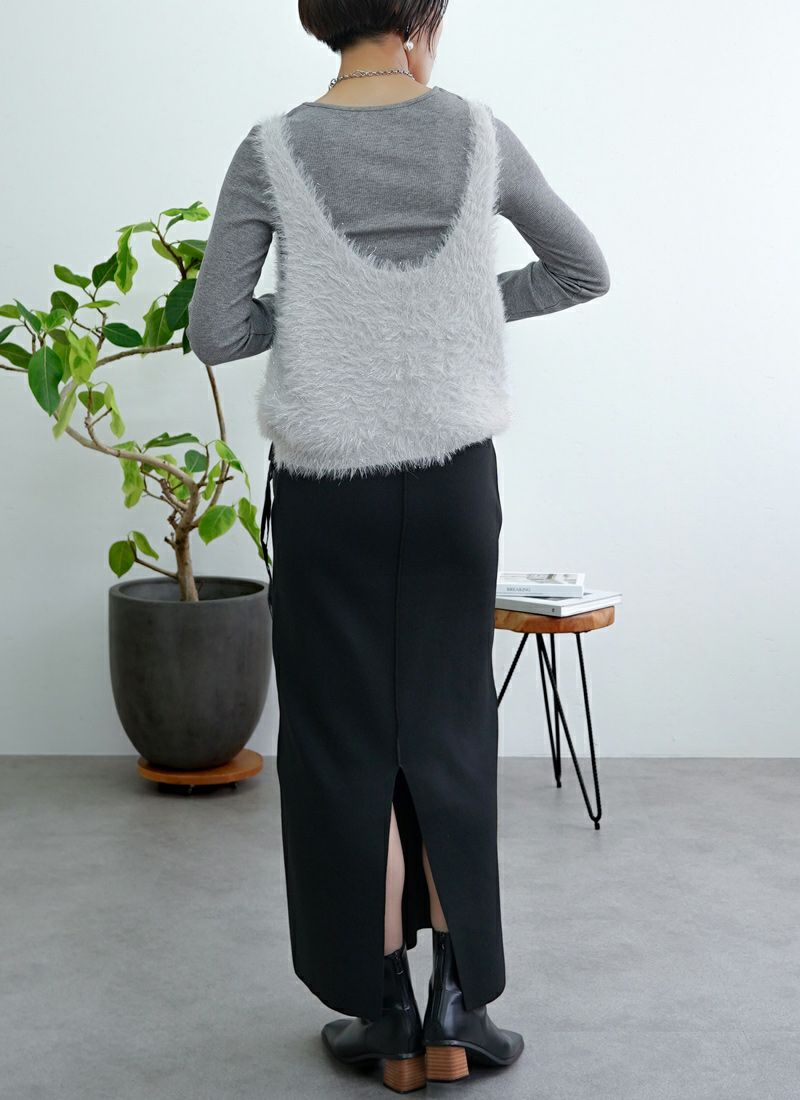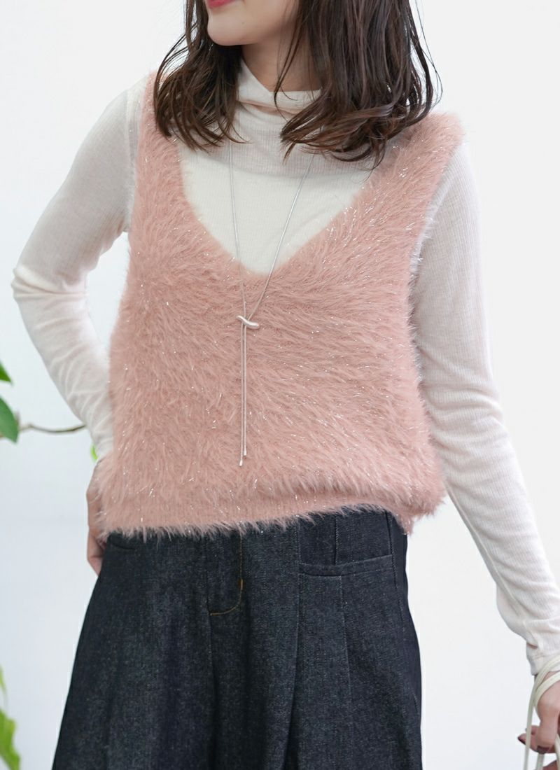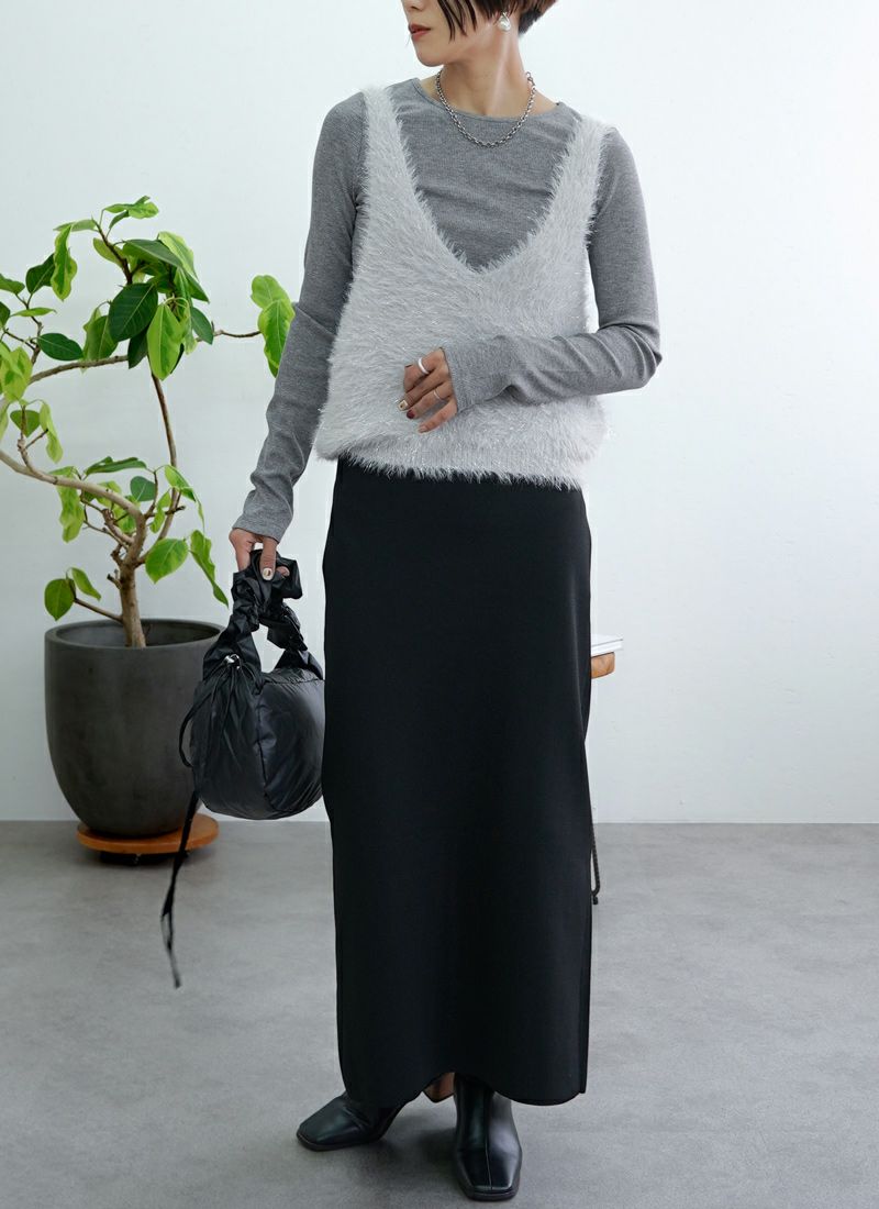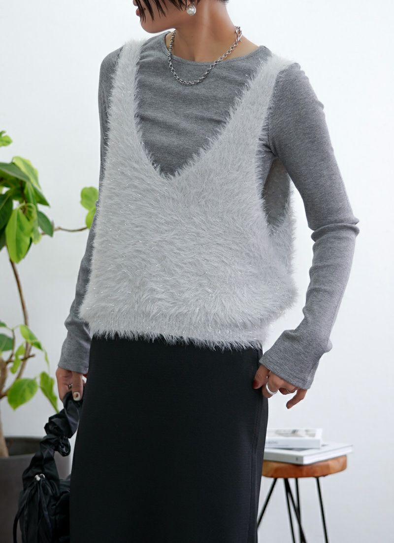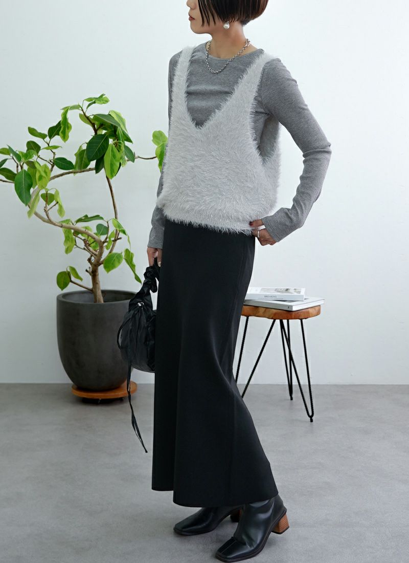 深めのVネックと、レイヤードがしやすい程よいショート丈のビスチェ。