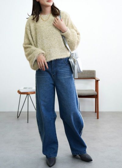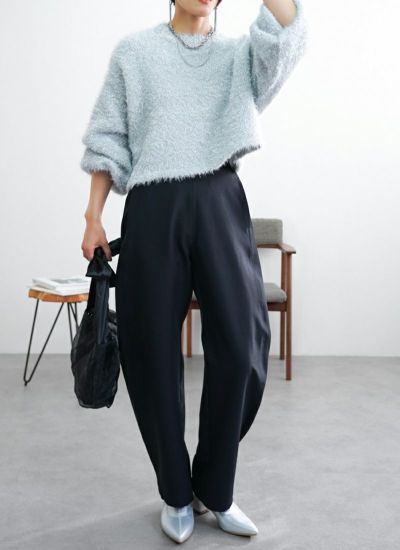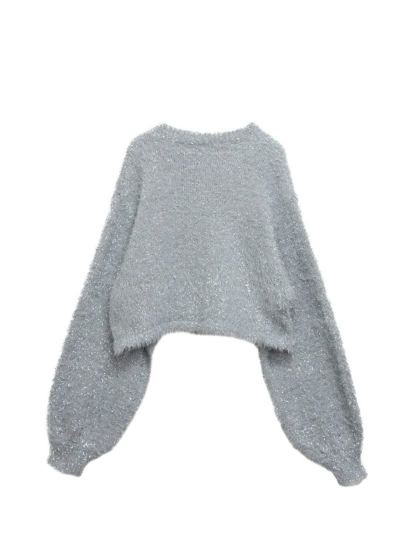 フェザーの糸と、ラメのフェザーを引きそろえたショート丈ニット。