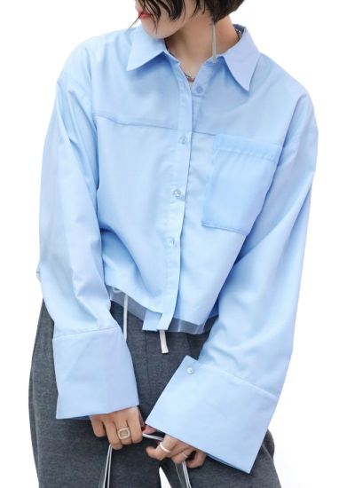 チュールがイヤードされたショート丈のシャツ。