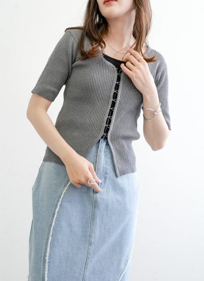 カーディガンとして羽織るのはもちろん、ホックを留めてトップス風に着こなすのもおすすめ。