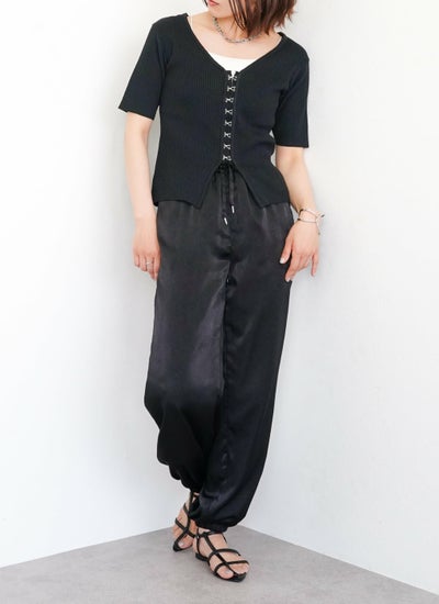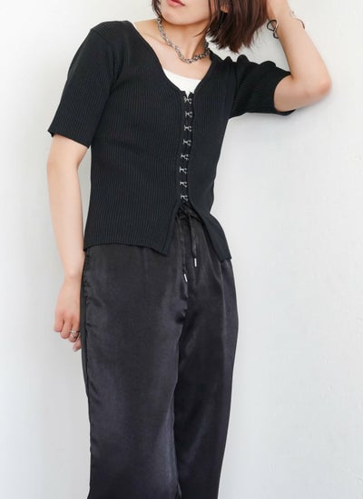 フロントのホックがアクセントになるモードな印象を与えるデザイン。