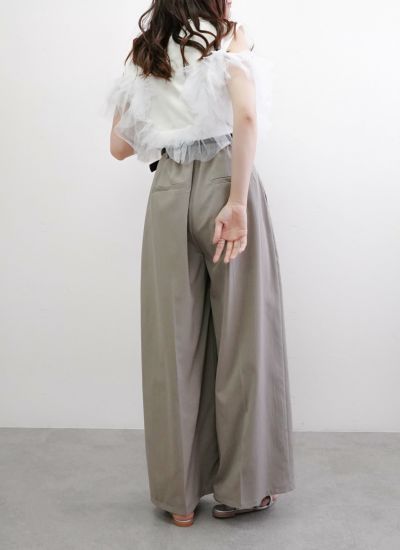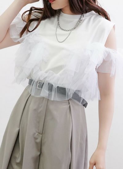 肩部分のチュールは固定されていない為、オフショルダー/ショルダーフリルの2WAY仕様。