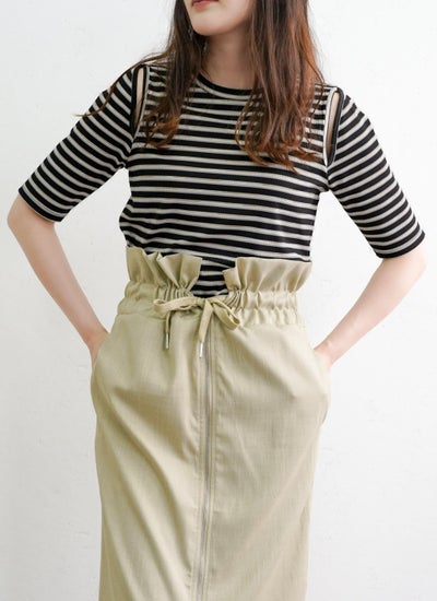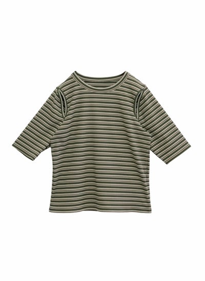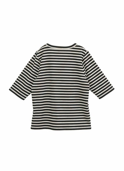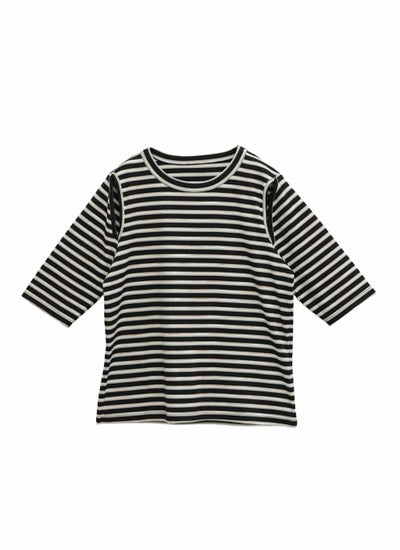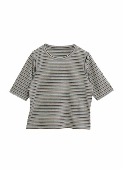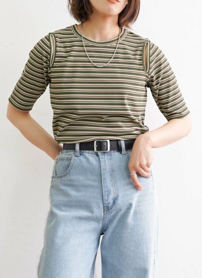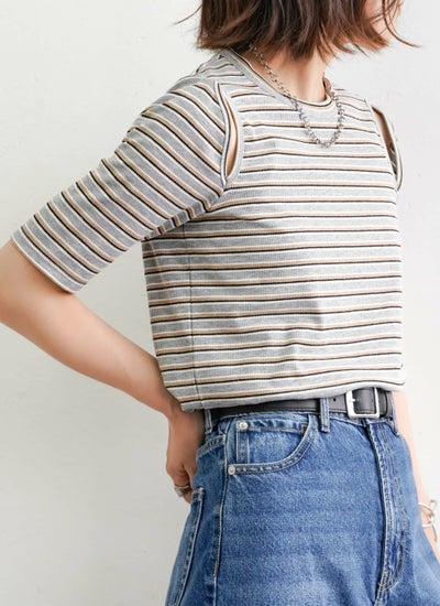 立体感のある細リブ×ボーダー柄が目を惹く、コンパクトシルエットのリブトップス。