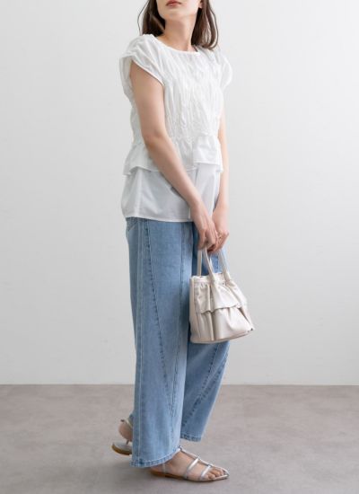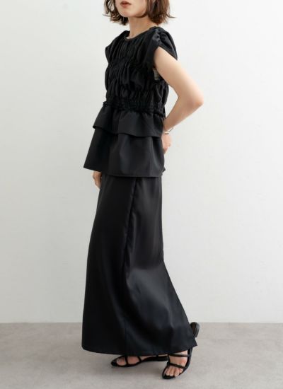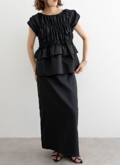 フリルの幅も変化をつけ、ウエストでキュッとフィットする、メリハリのあるシルエットに。