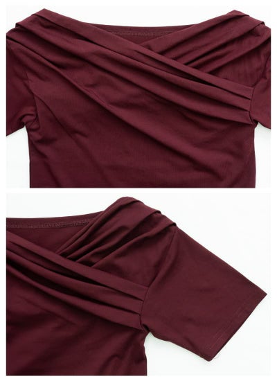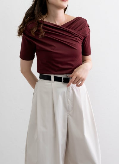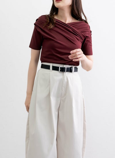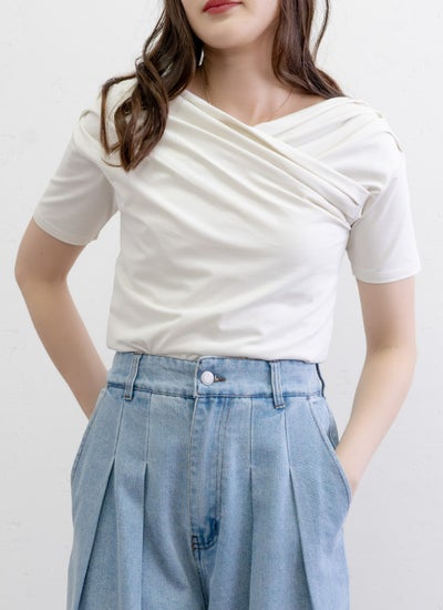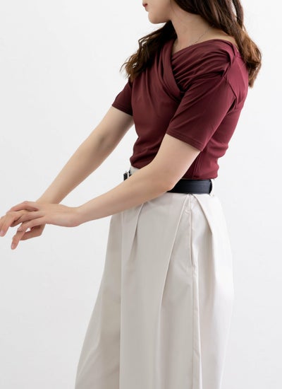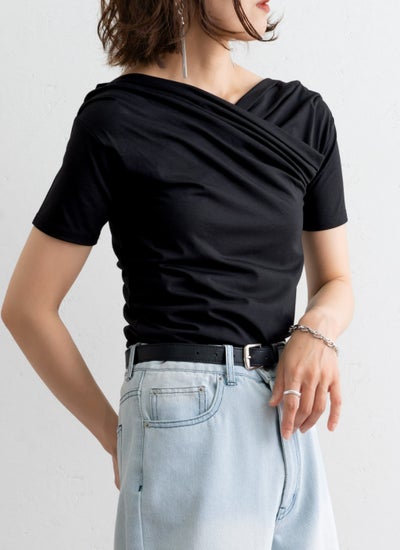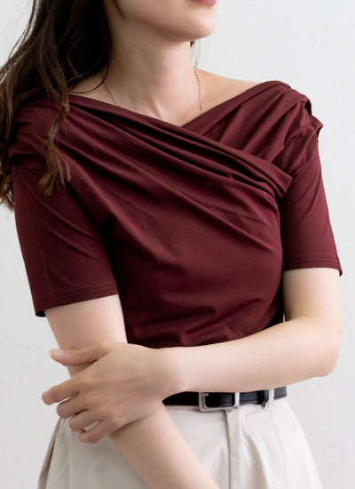 クロスさせたドレープデザインがデコルテを美しく見せる女性らしい印象のアイテム。