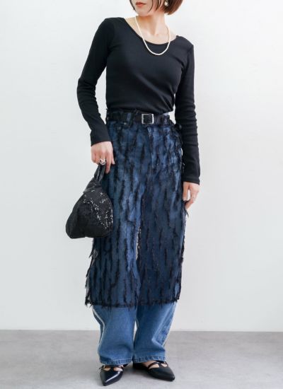 デニムやパンツ、スカートの上に重ねて、さまざまなスタイリングが楽しめるアイテムです。