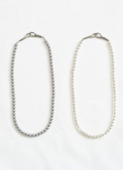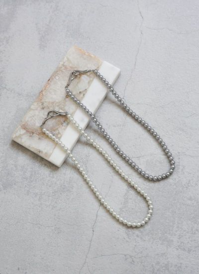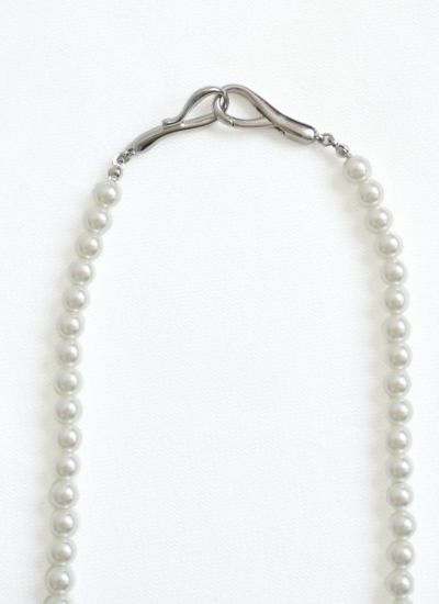 高級感のあるグラスパールのネックレスに、フックモチーフの留め具がアクセントになったデザイン。