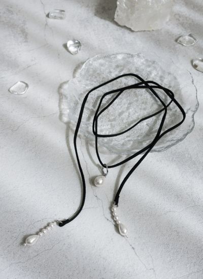 スウェード調のコードネックレスに、ドロップフォルムのパールがアクセントになったデザイン。