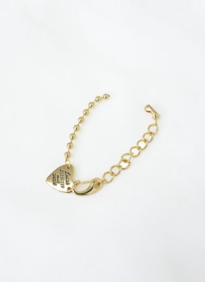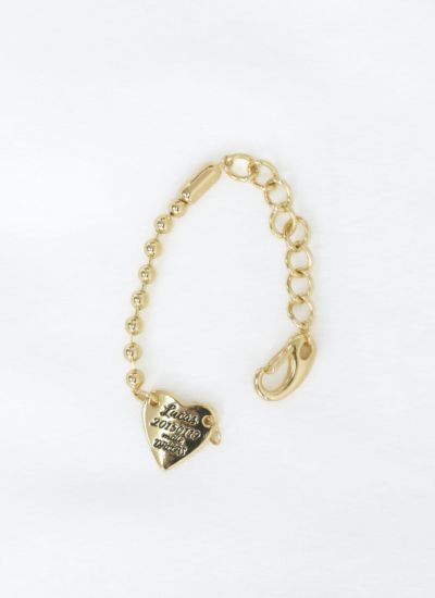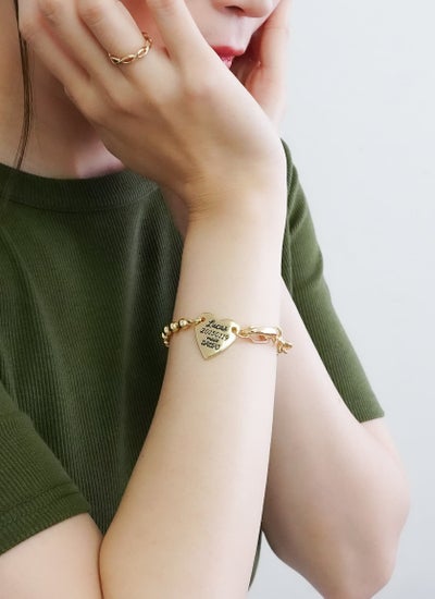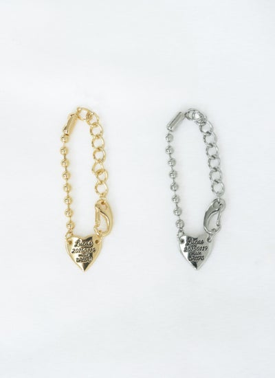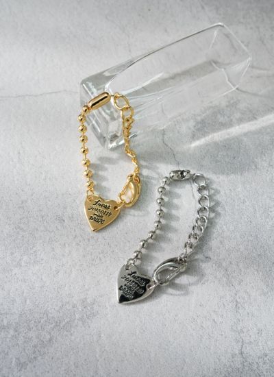 刻印入りのハートモチーフが目を引き、2種類のチェーンを組み合わせた個性的なアシンメトリーデザインは、程よいボリューム感で手元のアクセントに。