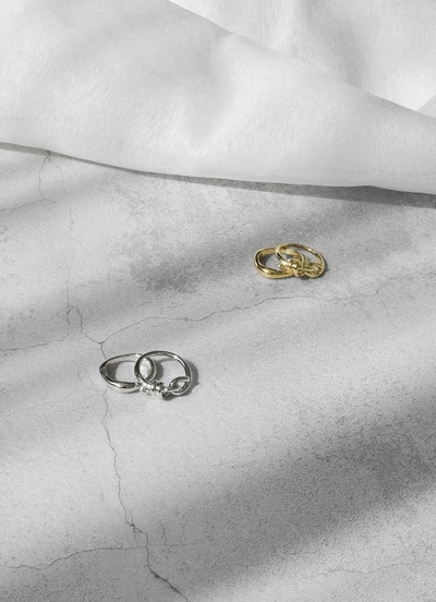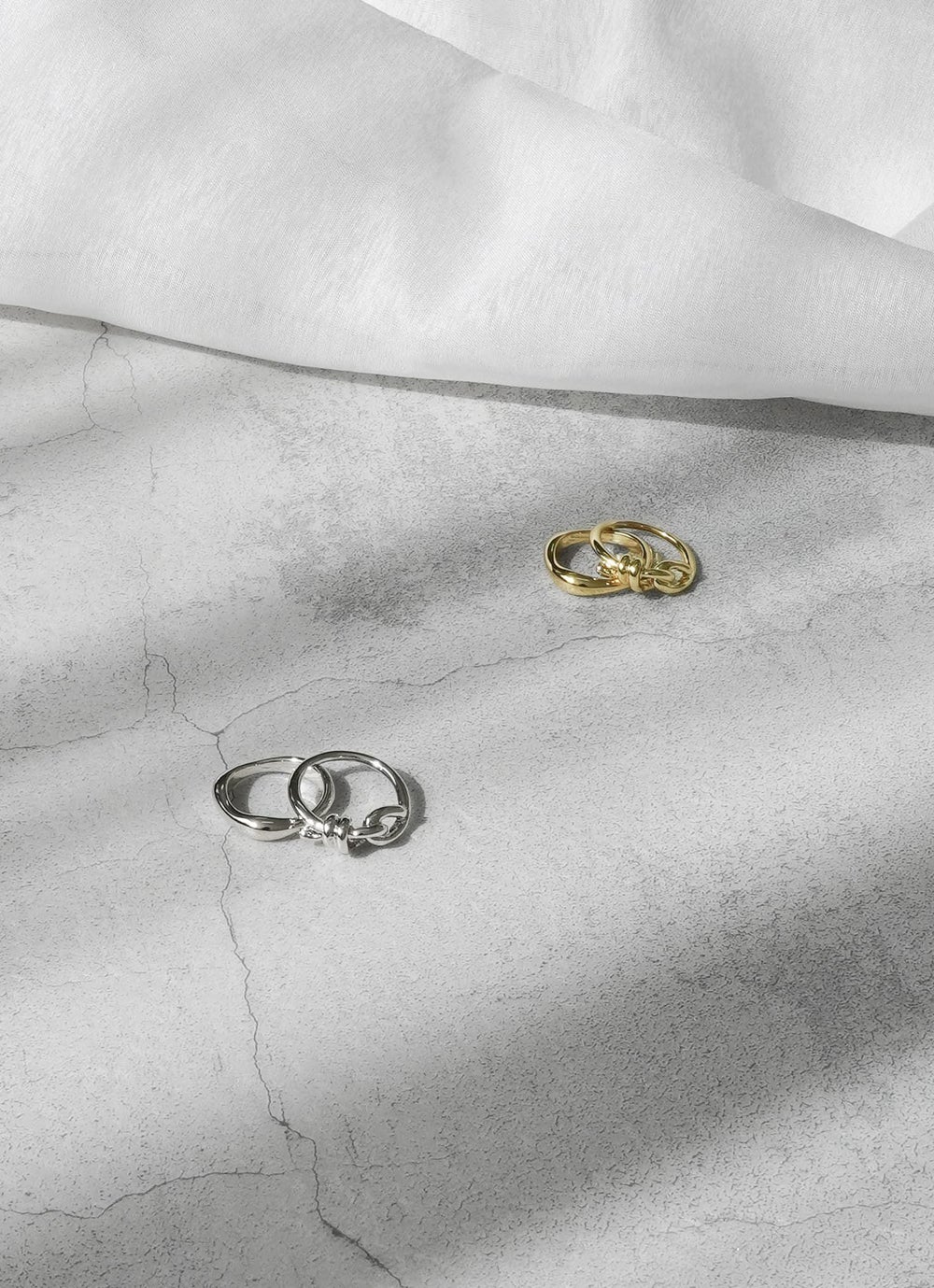 結び目が特徴的かつ魅力的なノットデザインとシンプルなラウンドデザインのセットリング。