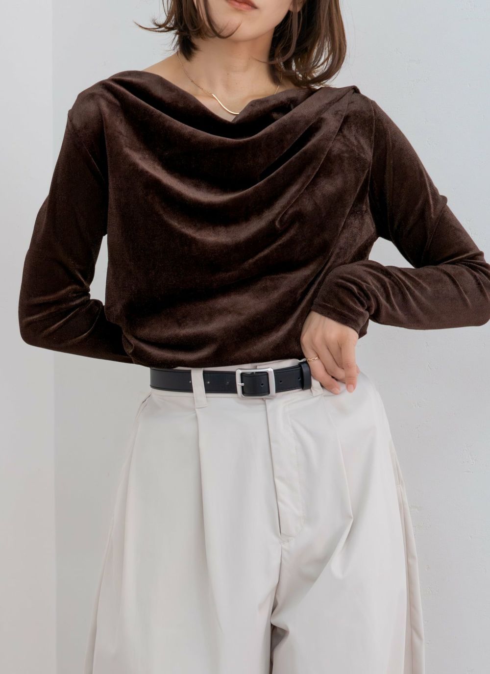 ほんのり艶めくシアーベロア素材が、上品でセンシュアルな雰囲気を演出。