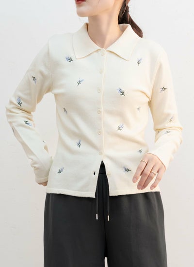 revoam【一着で旬顔!スッキリ細見え上品レディな小花刺繍ポロニット】 花柄刺繍ポロカーデ