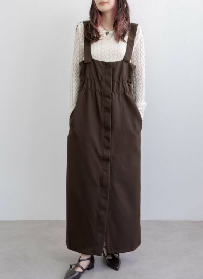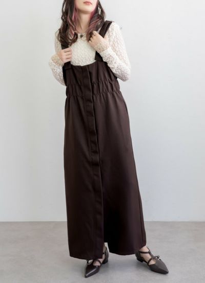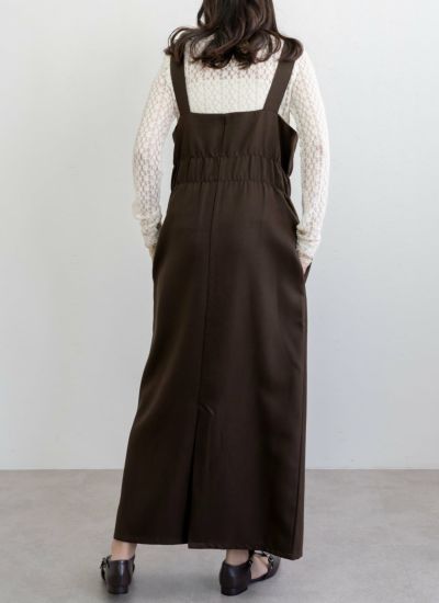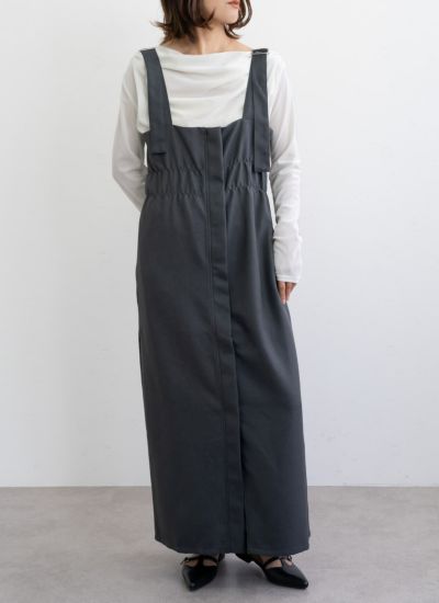 ほどよいハリと落ち感のあるヘザーエステル素材を使用した、上品見えのジャンパースカート。