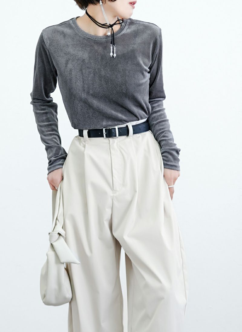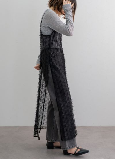 Tシャツやタートルネック、シアーアイテムやブラウスと合わせやすい万能的なアイテム。