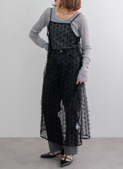 チュールリボンが縫いついた立体的なシアーキャミワンピース。