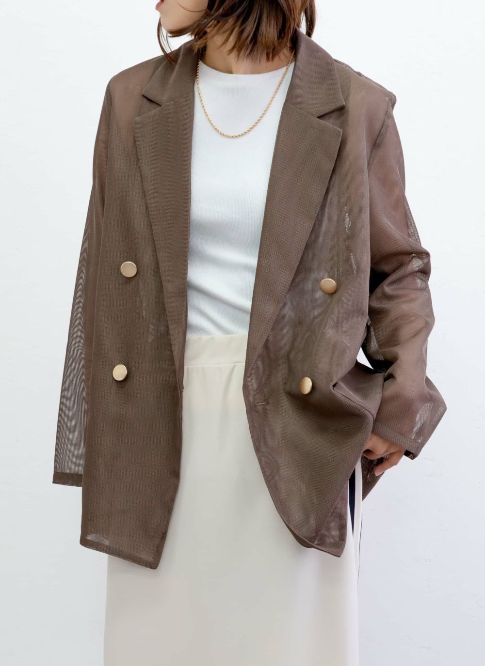 セミシアーメッシュ素材を使用したダブルテーラードジャケット。