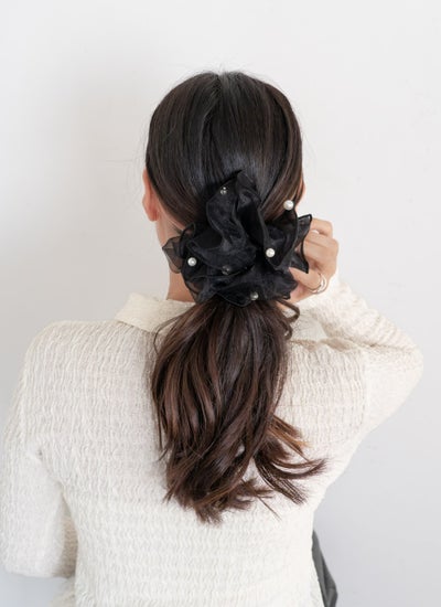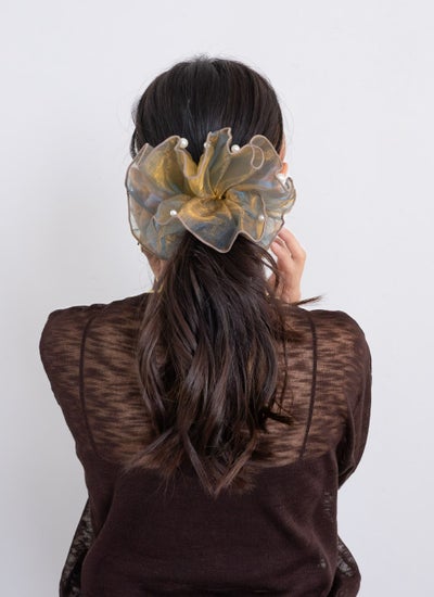 光沢のあるシアー生地のシュシュは大ぶりで、いつものまとめ髪にさっと取り入れるだけで女性らしく華やかな後ろ姿を演出します。