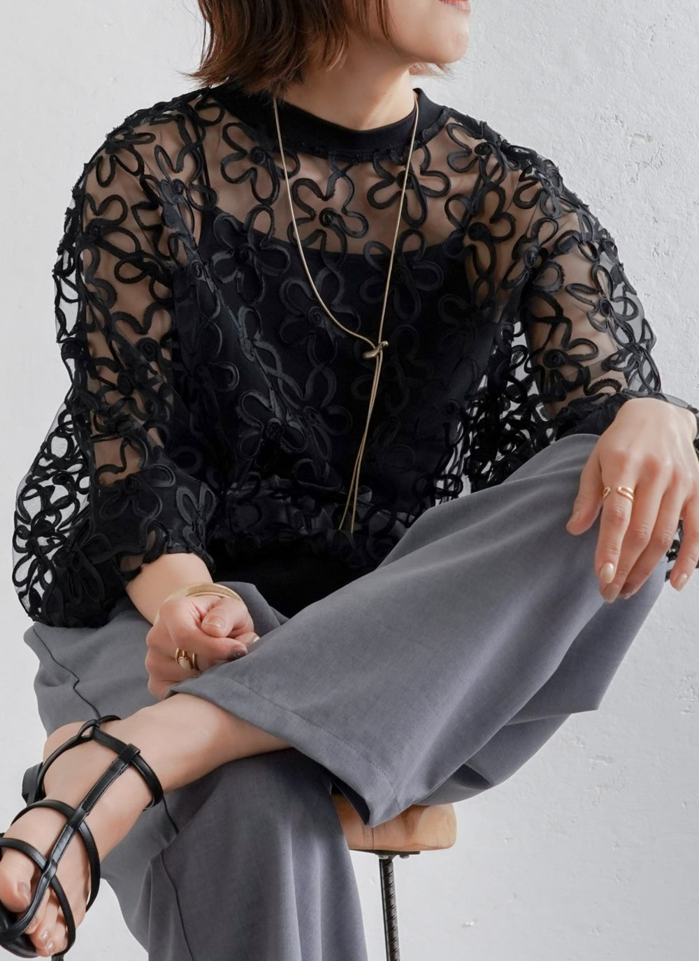 ショート丈のブラウスやシャツを合わせる。