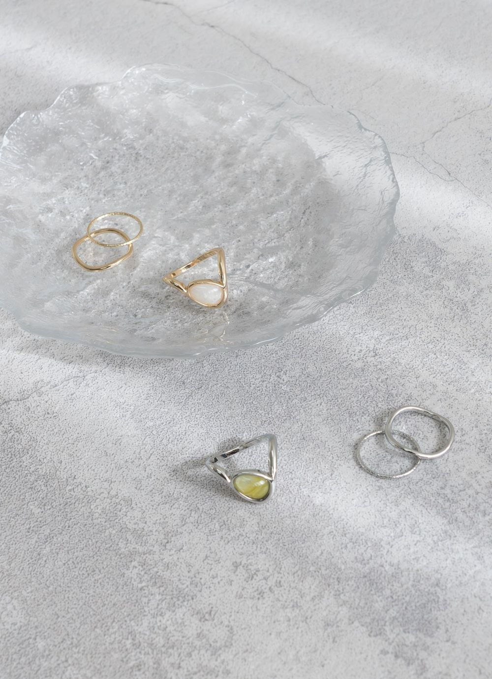 マーブル感のあるドロップモチーフが目を惹く、品のある細く華奢なデザインの3本セットリング。