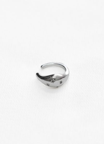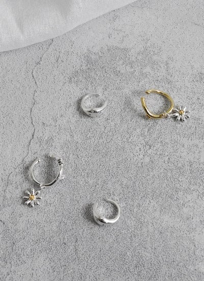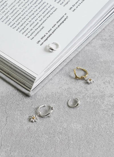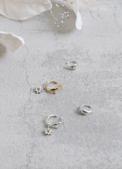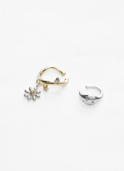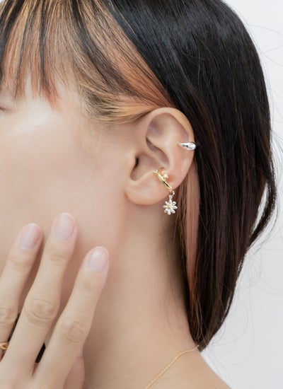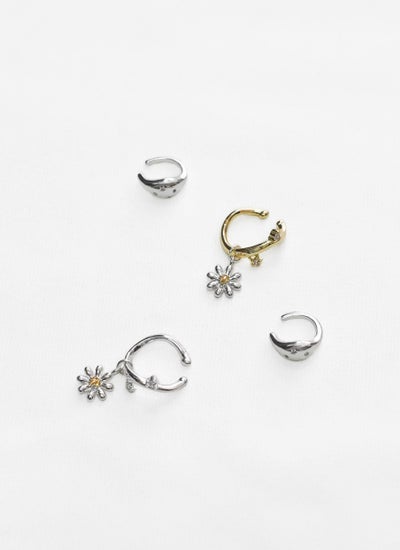 小さく揺れるフラワーモチーフが目を惹くイヤーカフと、キュービックジルコニアが散りばめられたイヤーカフの2個セット。