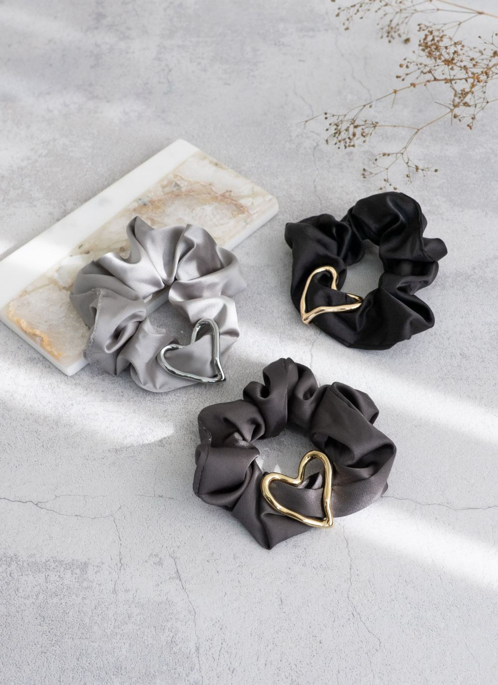 メタル素材のハートモチーフがアクセントになり、シンプルなサテン生地のシュシュに程よいゴージャス感をプラスします。