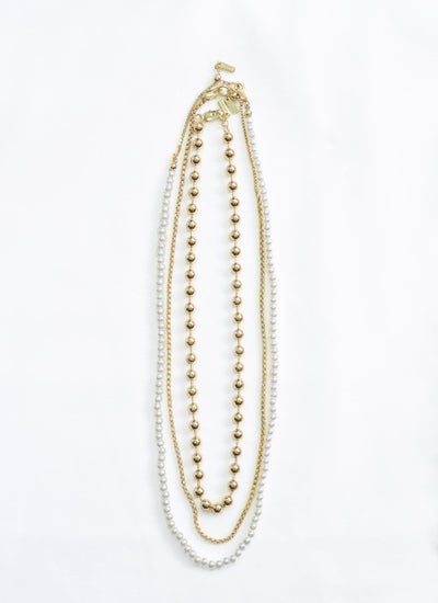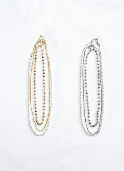 シンプルなパールネックレスと、ボールチェーン、ボックスチェーンの3本セットは、それぞれ単体での着用も可能なマルチWAYアイテム。