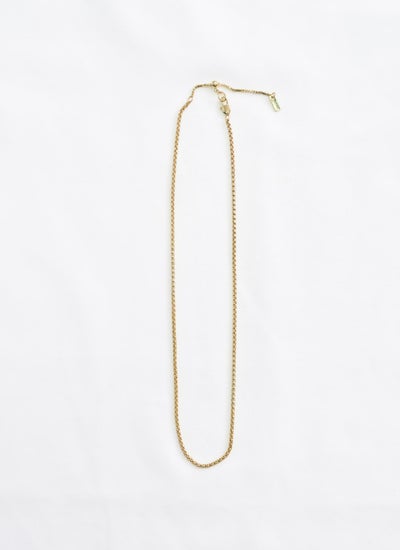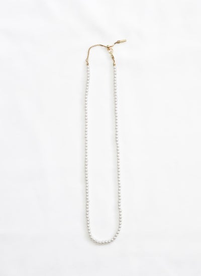 パールとボックスチェーンのネックレスはスライドビーズを動かすことで長さを調節できるので、その日の気分やコーディネートによって雰囲気を変えられるのもポイント。
