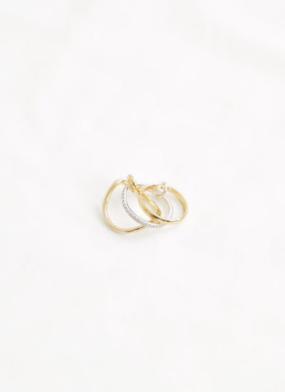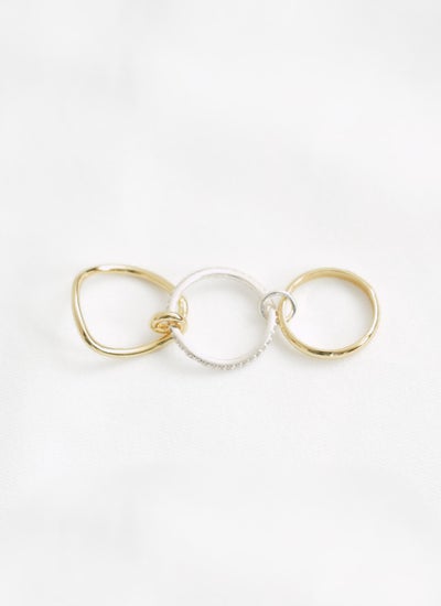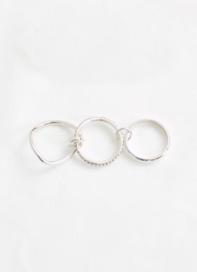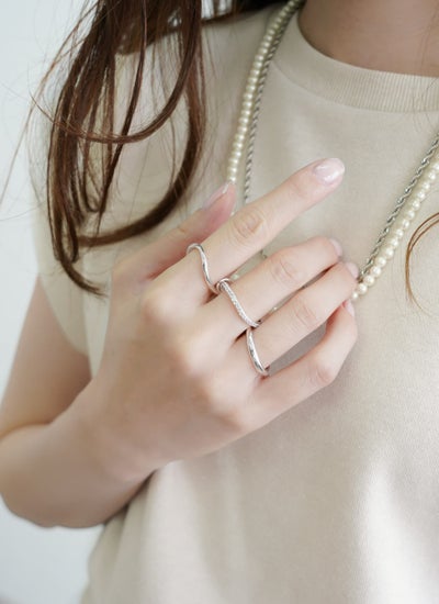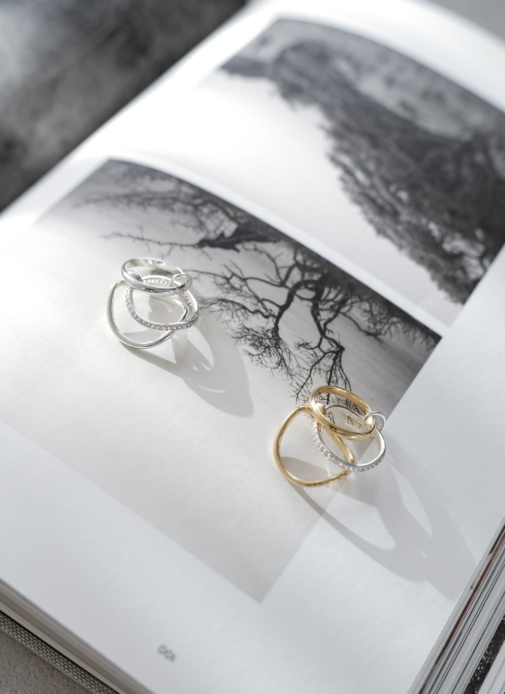 屈折率がダイヤモンドに近く、硬度もコランダムほどある『キュービックジルコニア』をあしらったリング、ニュアンス感のあるリング、ベーシックなリングの3本が繋がったデザイン。