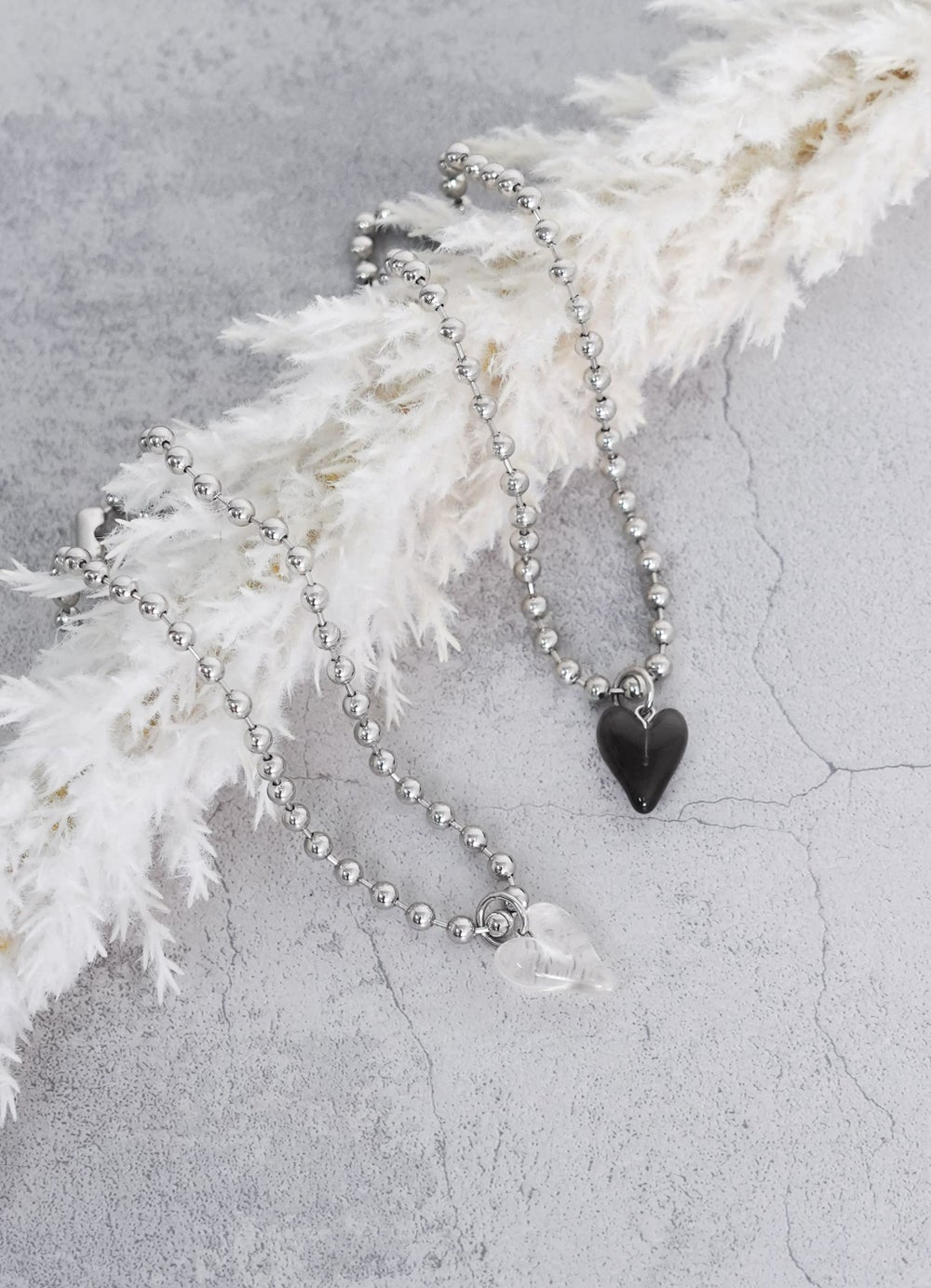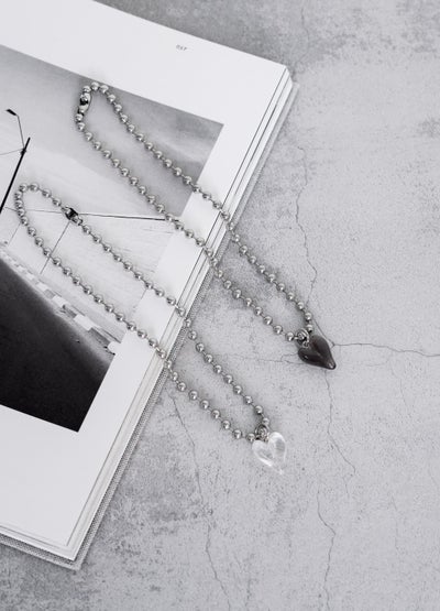 存在感を放つ大粒のボールチェーンと、人気のハートモチーフのコンビネーションデザイン。光を取り込むクリア素材が、胸元を明るく華やかに演出します。