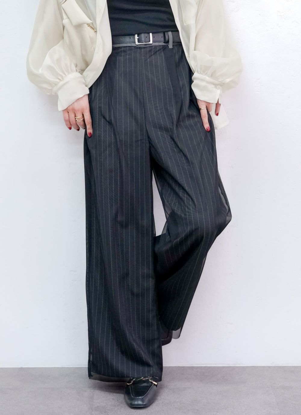 revoam【チュールでほんのり抜け感。きちんと見えも叶える大人女性のきれいめパンツ】 【20%OFF】ピンストライプチュールレイヤードパンツ
