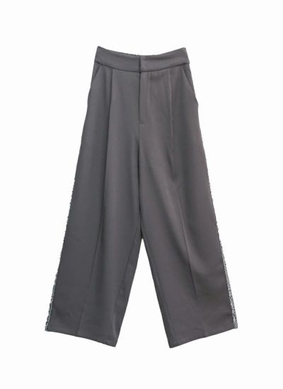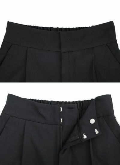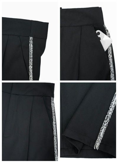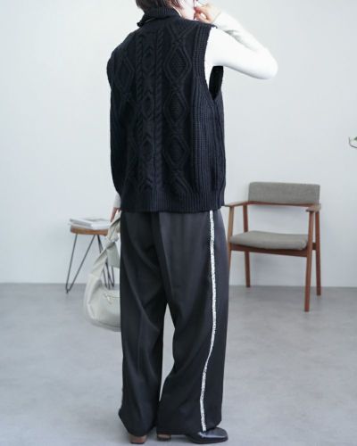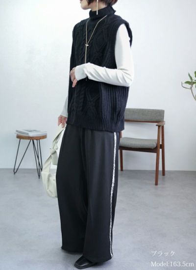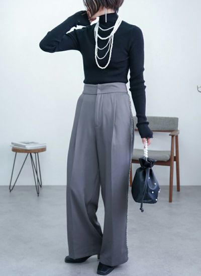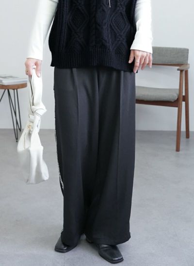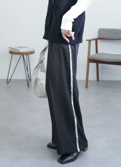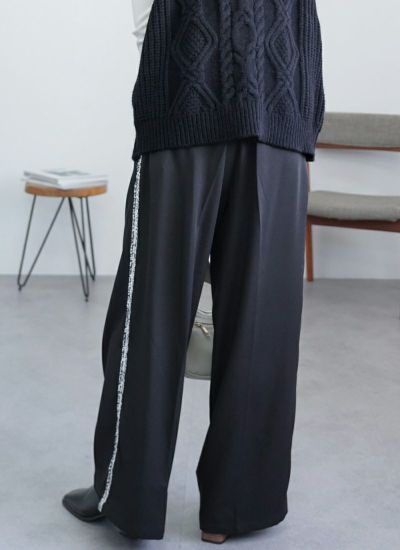 サイドラインにシルバーフリンジをあしらった、華やかでモードな印象のタックワイドスラックスパンツ。