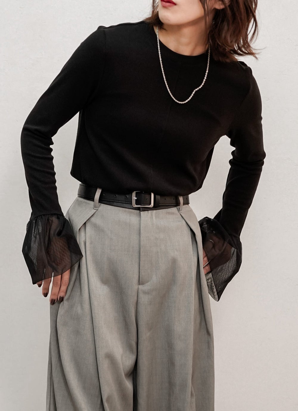 グレーやブラックのタイトなトップスを合わせ、全体をモノトーンでまとめると、エッジの効いた洗練された印象に。