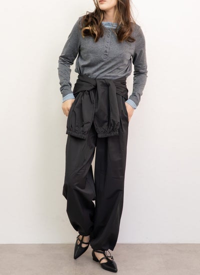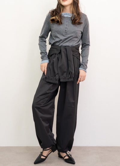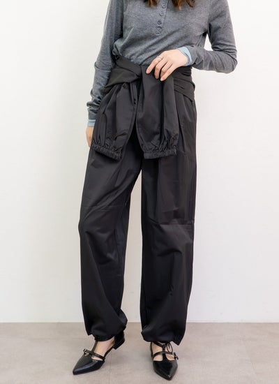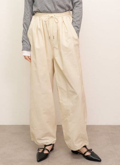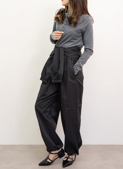 全体的にゆったりとしたワイドなバルーンシルエットで、裾はゴムで絞られたジョガーパンツ仕様になっています。