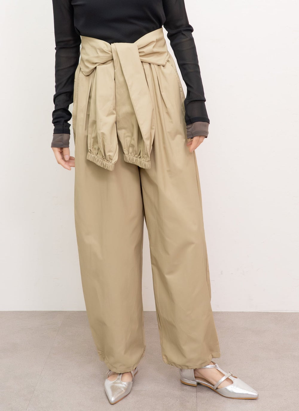 ウエスト部分に袖のようなパーツがあしらわれており、結び方次第でシルエットに変化をつけることができます。