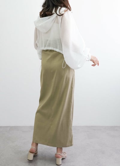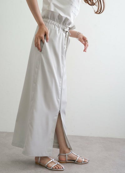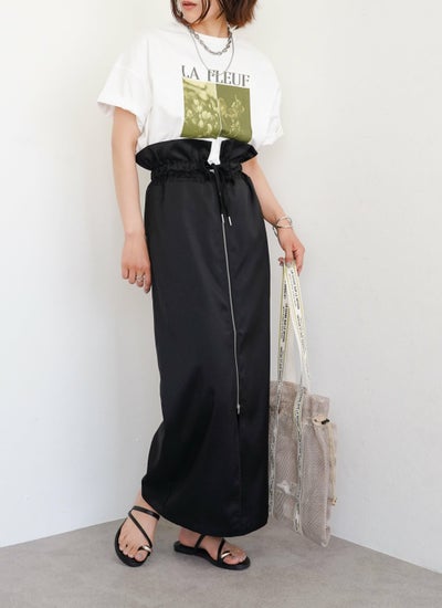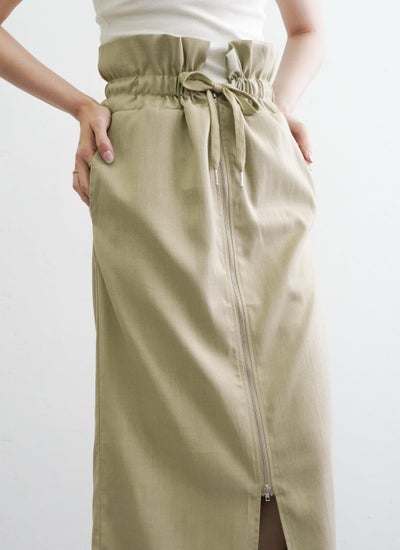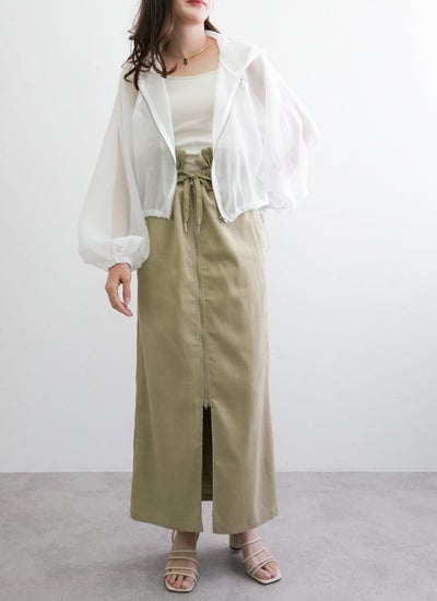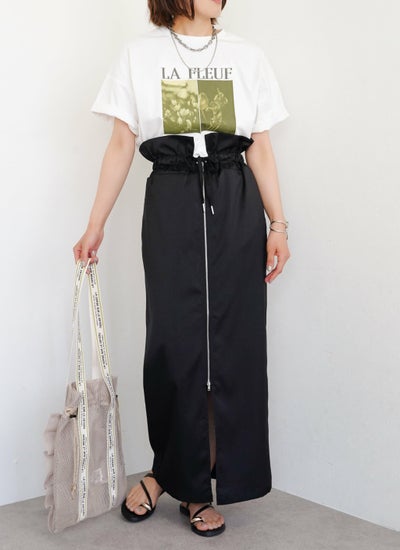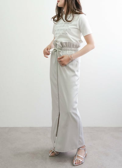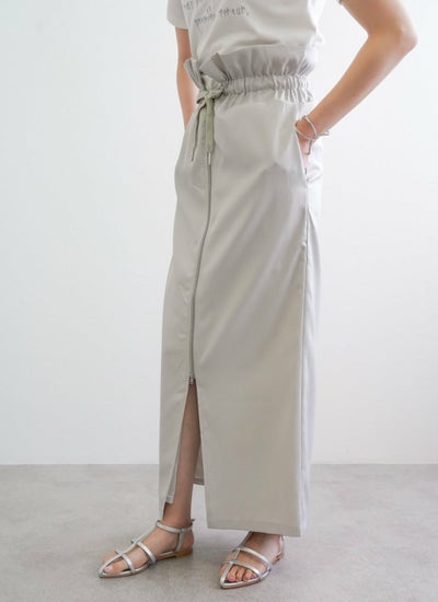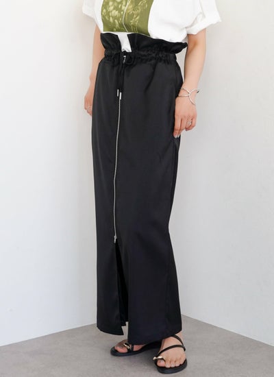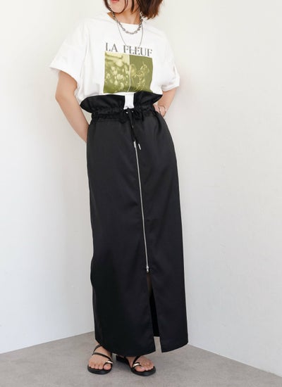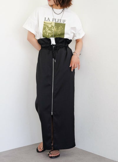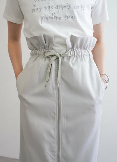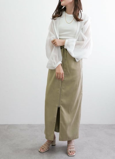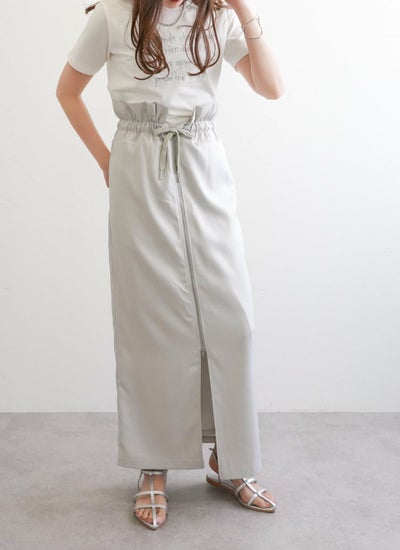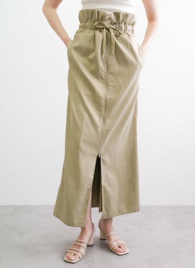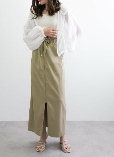 フロントに入ったZIPやウエストギャザーがアクセントになり、トレンド感あるスカート! 柔らかさもありつつ程よいハリ感のある生地なので、カジュアルにもきれいめにもマッチします。 ウエストはドロスト仕様でストレスフリーな着用感です。