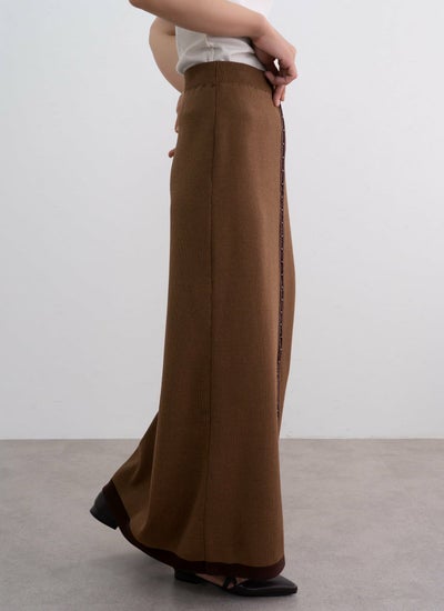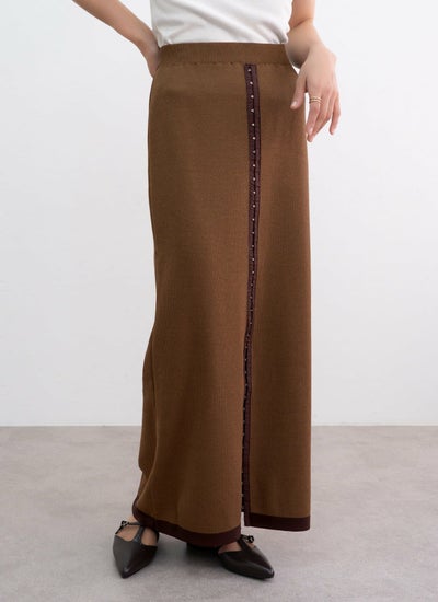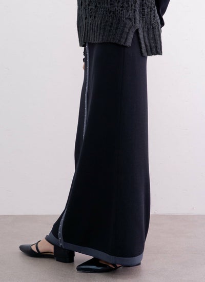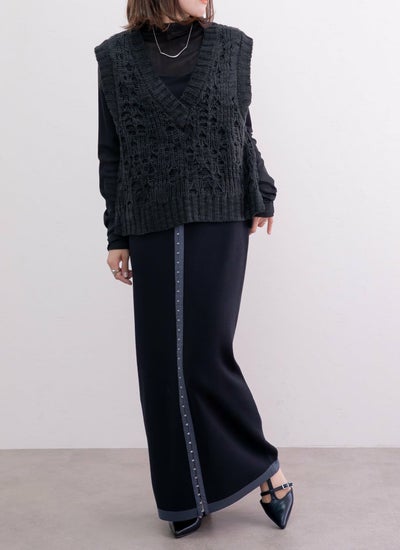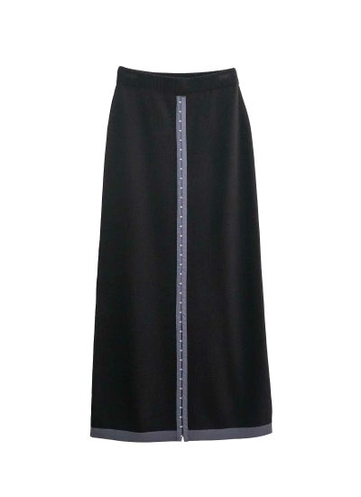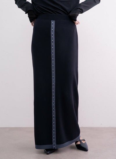 縦ラインを強調した配色デザインとホック装飾が特徴的なロングスカートです。