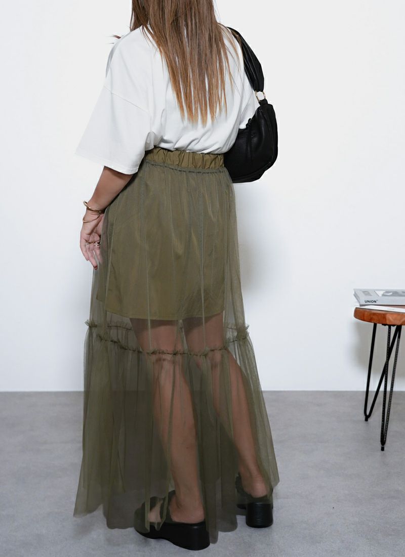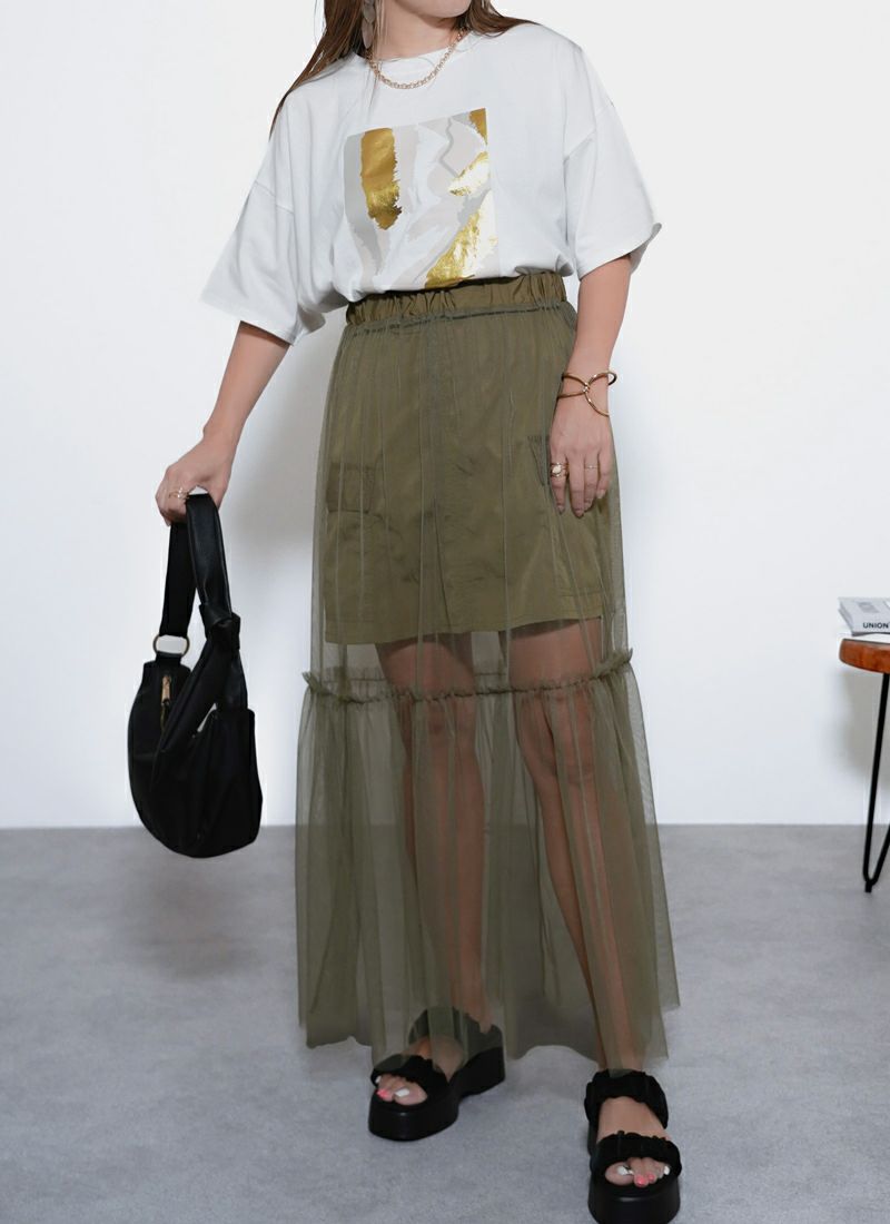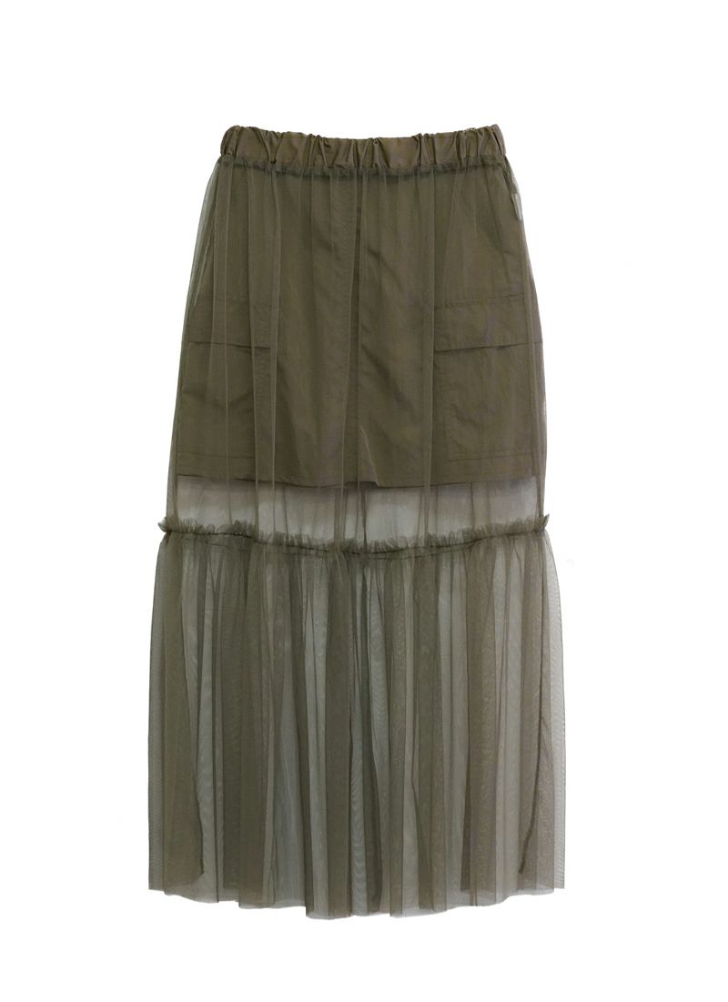revoam【歩くたび、透け感ゆれる。大人に似合うティアードチュール】 【35%OFF】チュール×メタリックタフタ ティアードスカート