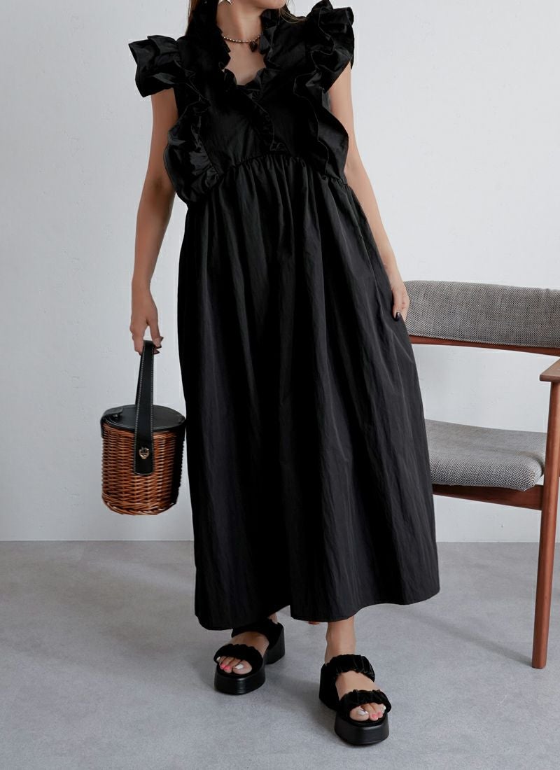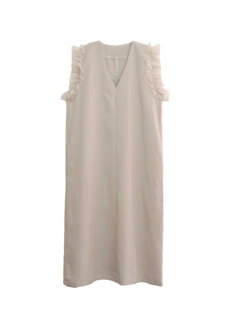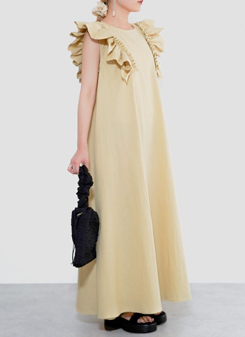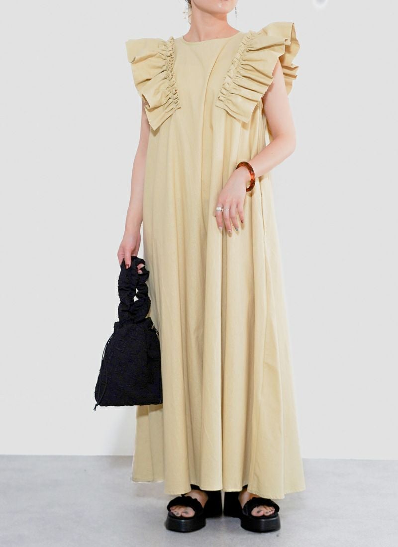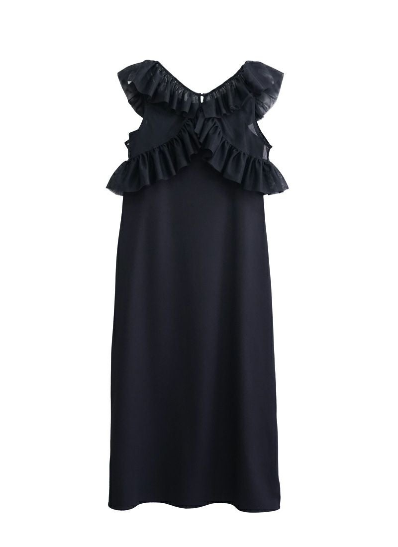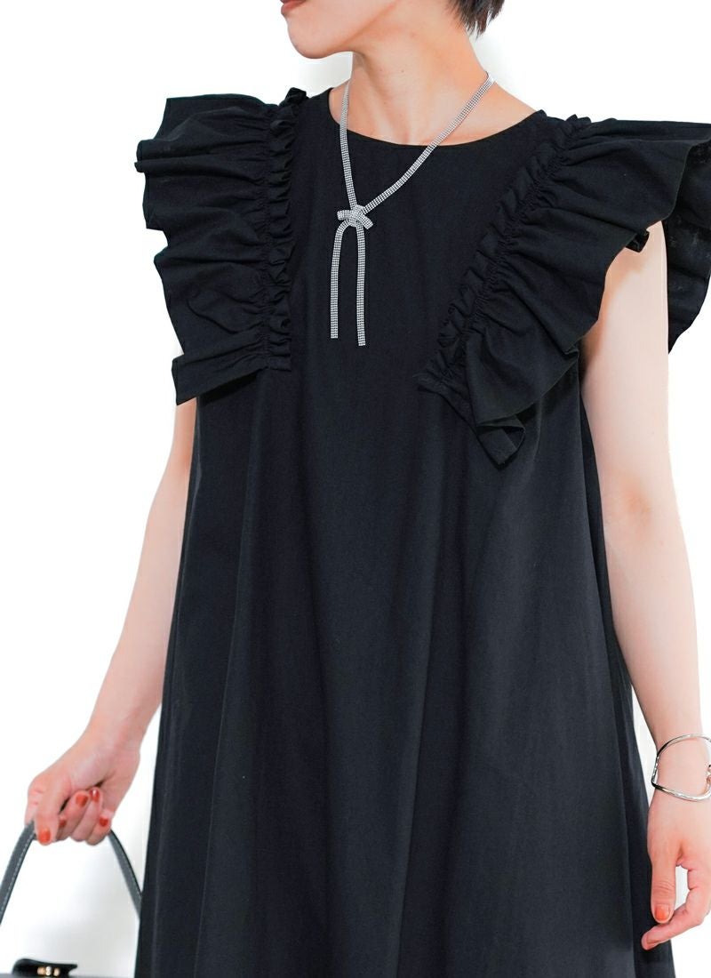 revoam【甘すぎないフリルが絶妙。一枚で“上品かわいい”が叶う、洗練デザイン】 【30%OFF】ツイル肩フリル付ワンピース