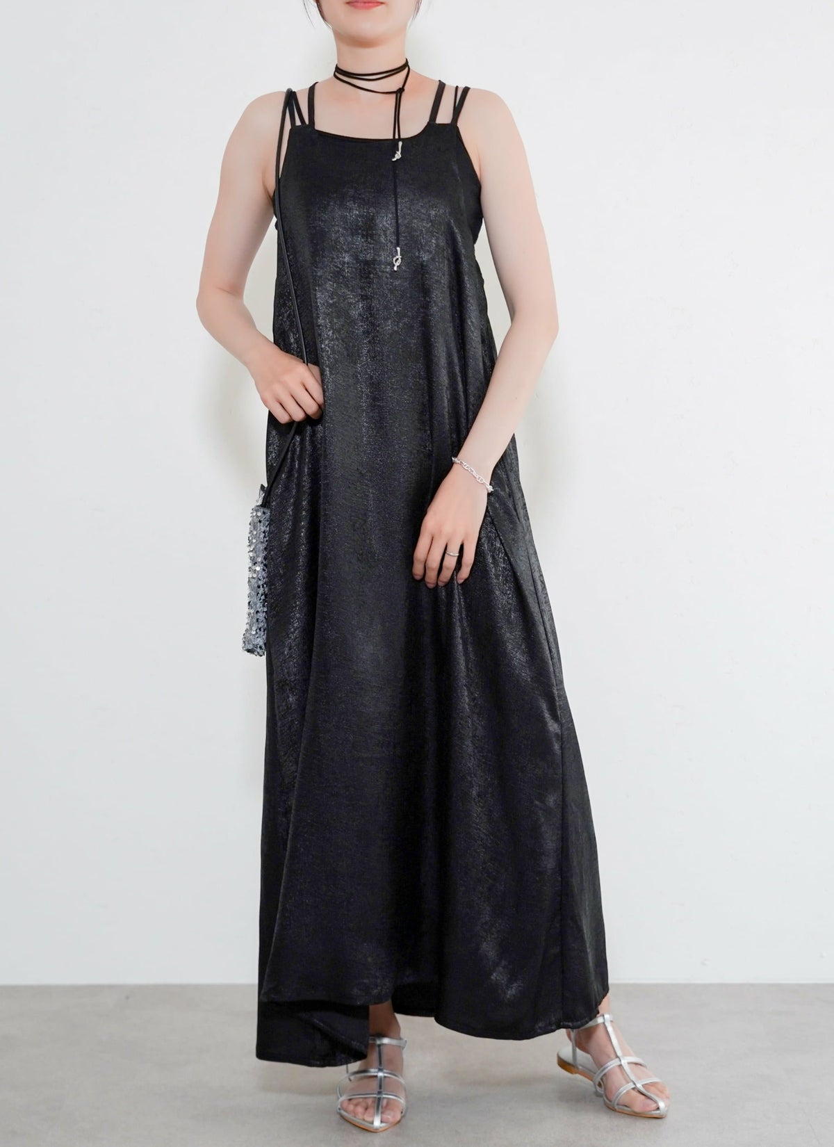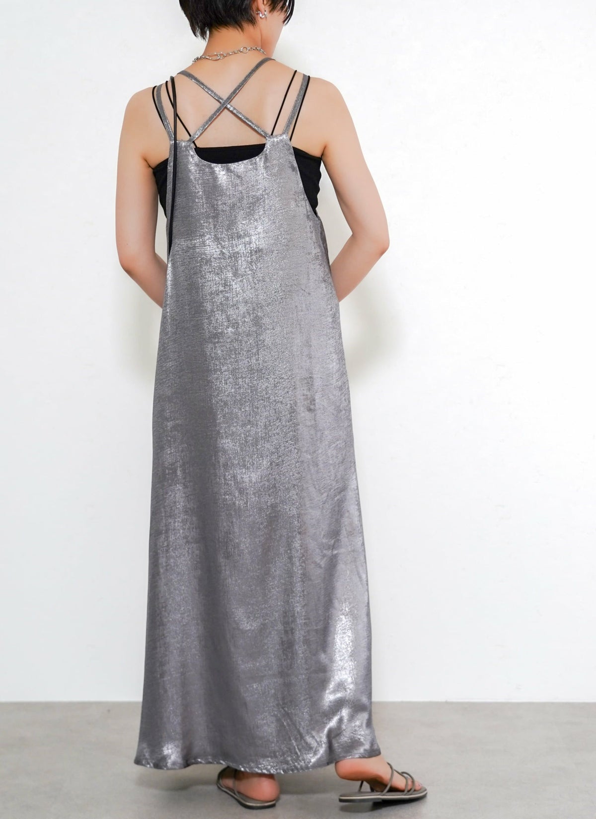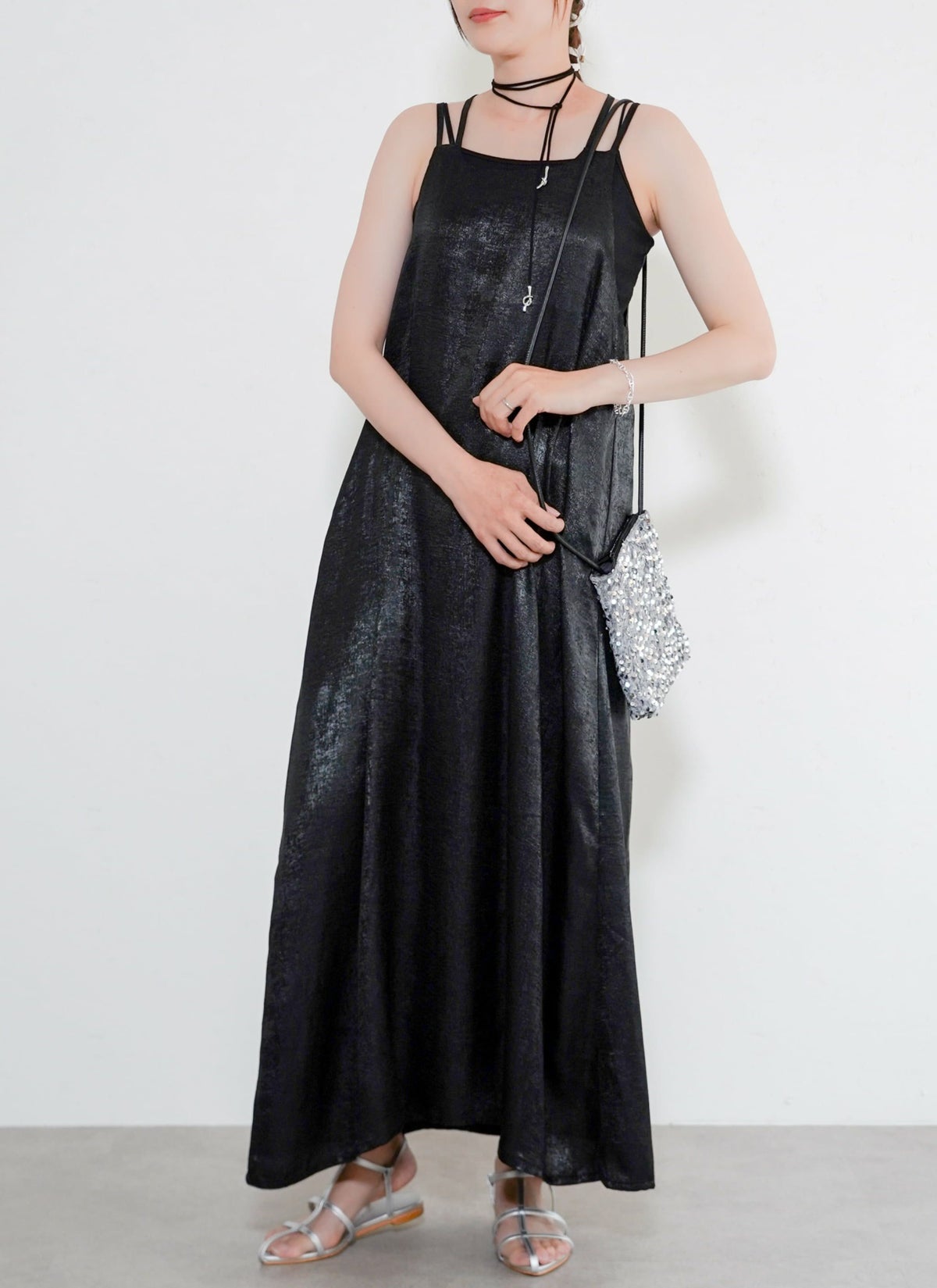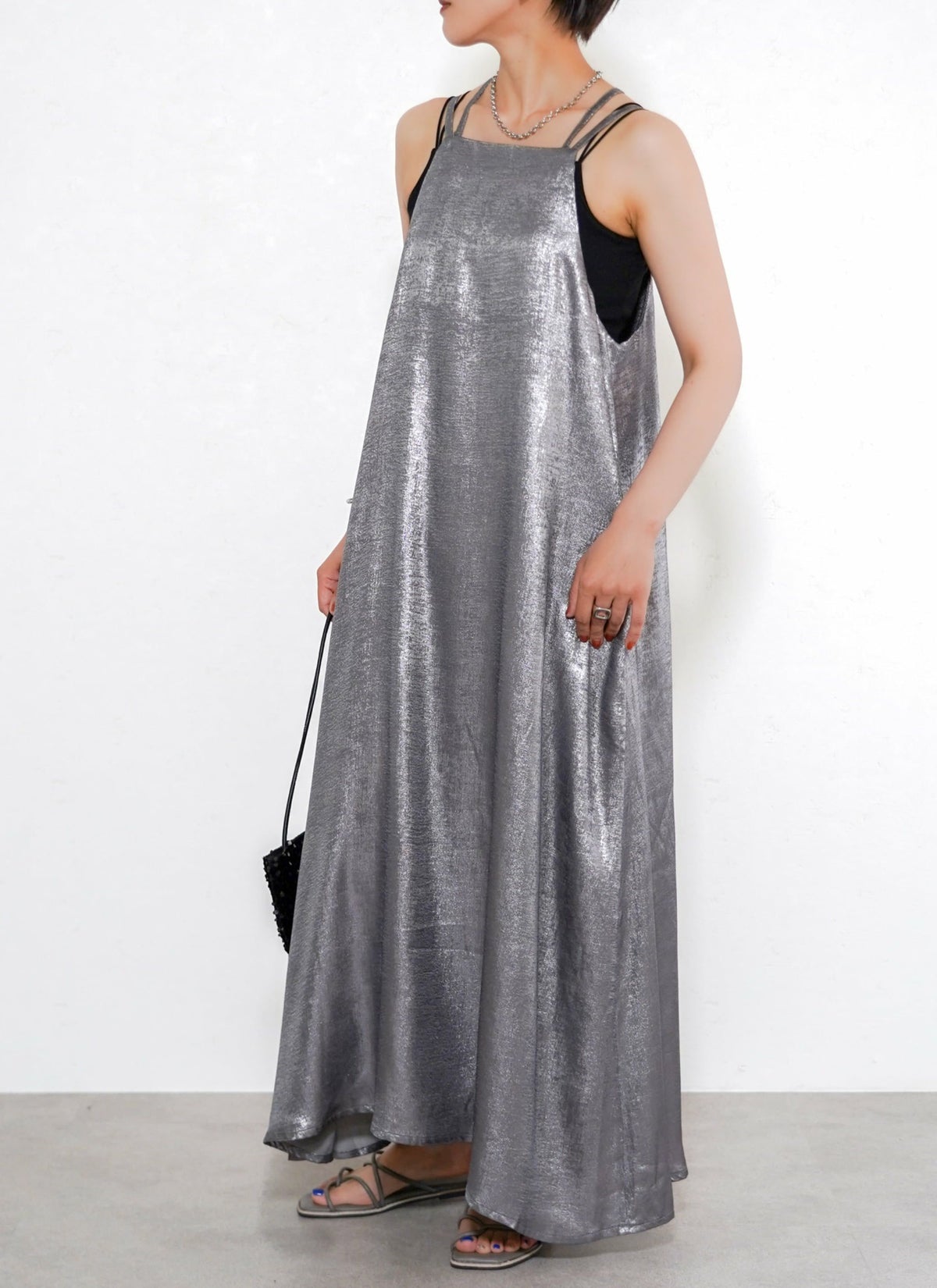 revoam【とろみ素材×シャイニー感で魅せる、リゾートにも街にも映える一枚】 【30%OFF】シャイニーキャミワンピース